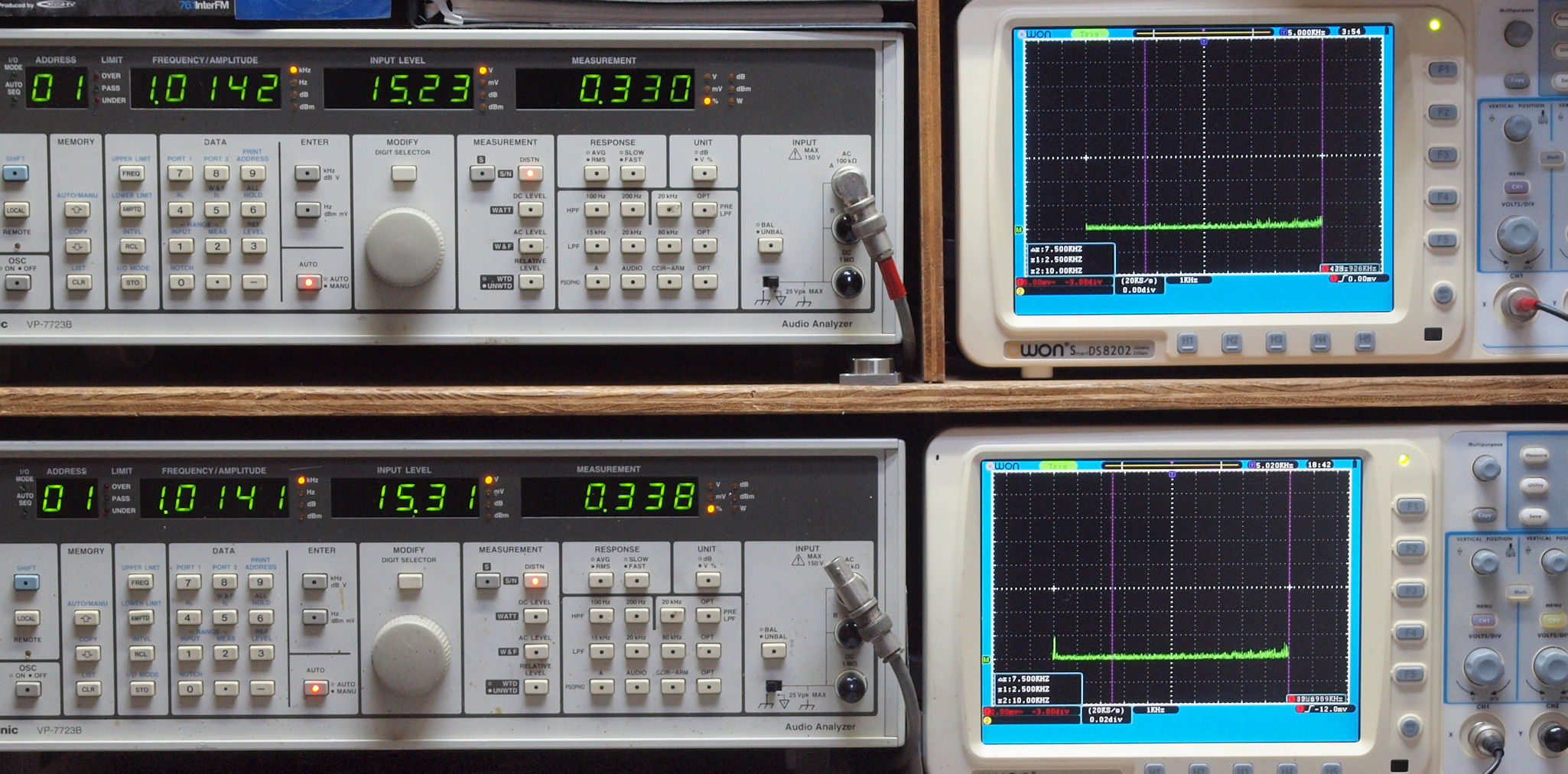 | E. 測定・調整。 画像をクリックすると、大きく(横幅2050ドット)表示されます。 E0. 出力・歪み率測定・調整 「見方」。 上段中 右側SP出力を「Audio Analyzer Panasonic VP−7723B」により測定。 表示LED、 左端=メモリーNo、 中左=周波数測定、 中右=出力電圧測定、 右端=歪み率測定。 上段右端 VP−7723Bの基本波除去出力を「owon SDS8202(200MHZ)」で「FFT分析」表示。 下段中 左側SP出力を「Audio Analyzer Panasonic VP−7723B」により測定。 表示LED、 左端=メモリーNo、 中左=周波数測定、 中右=出力電圧測定、 右端=歪み率測定。 下段右端 VP−7723Bの基本波除去出力を「owon SDS6062(200MHZ)」で「FFT分析」表示。 下段左端 オーディオ発振器 VP−7201A より50Hz〜100kHzの信号を出し(歪み率=約0.003%)、ATT+分配器を通し、AMPに入力。 よって、ダイアル設定出力レベルより低くなります。測定機器の仕様や整備の様子はこちら、「VP−7723B」「VP−7201A」。 FFT画面の見方はこちら。 |