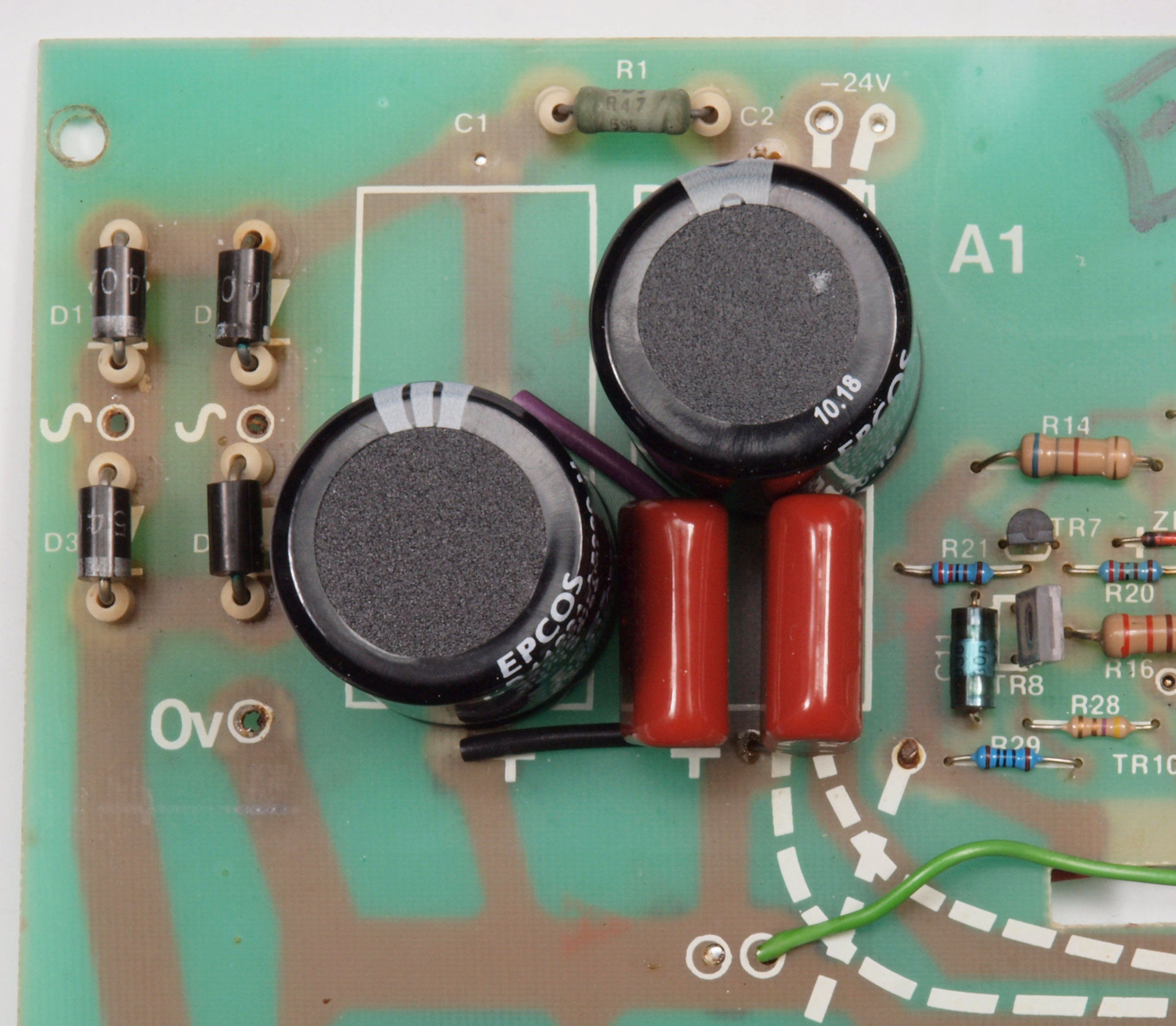| C72. 修理後 電源基板。 電解コンデンサー4個交換、フイルムコンデンサー4個追加。 | ||||||||||||||||||||