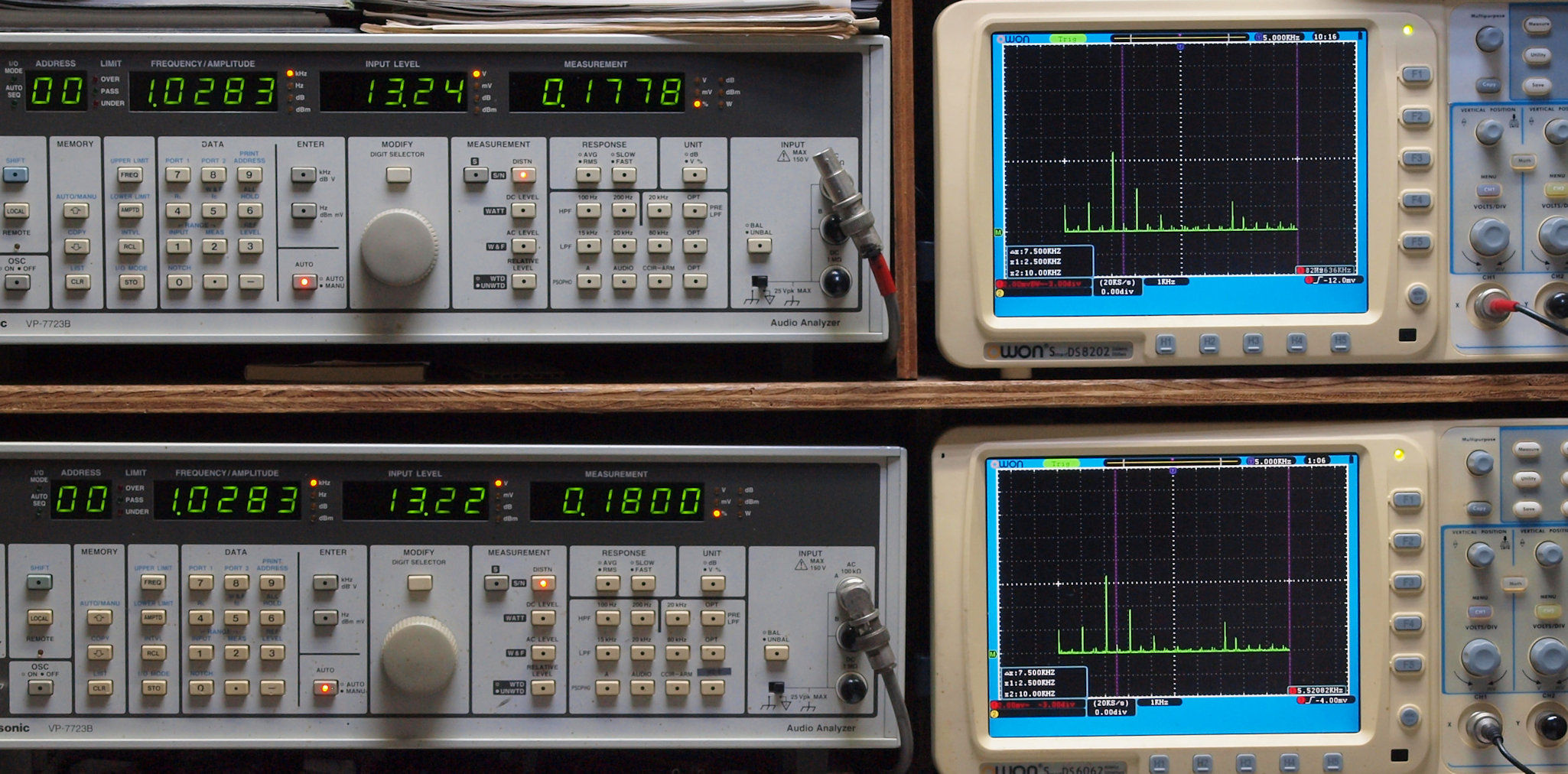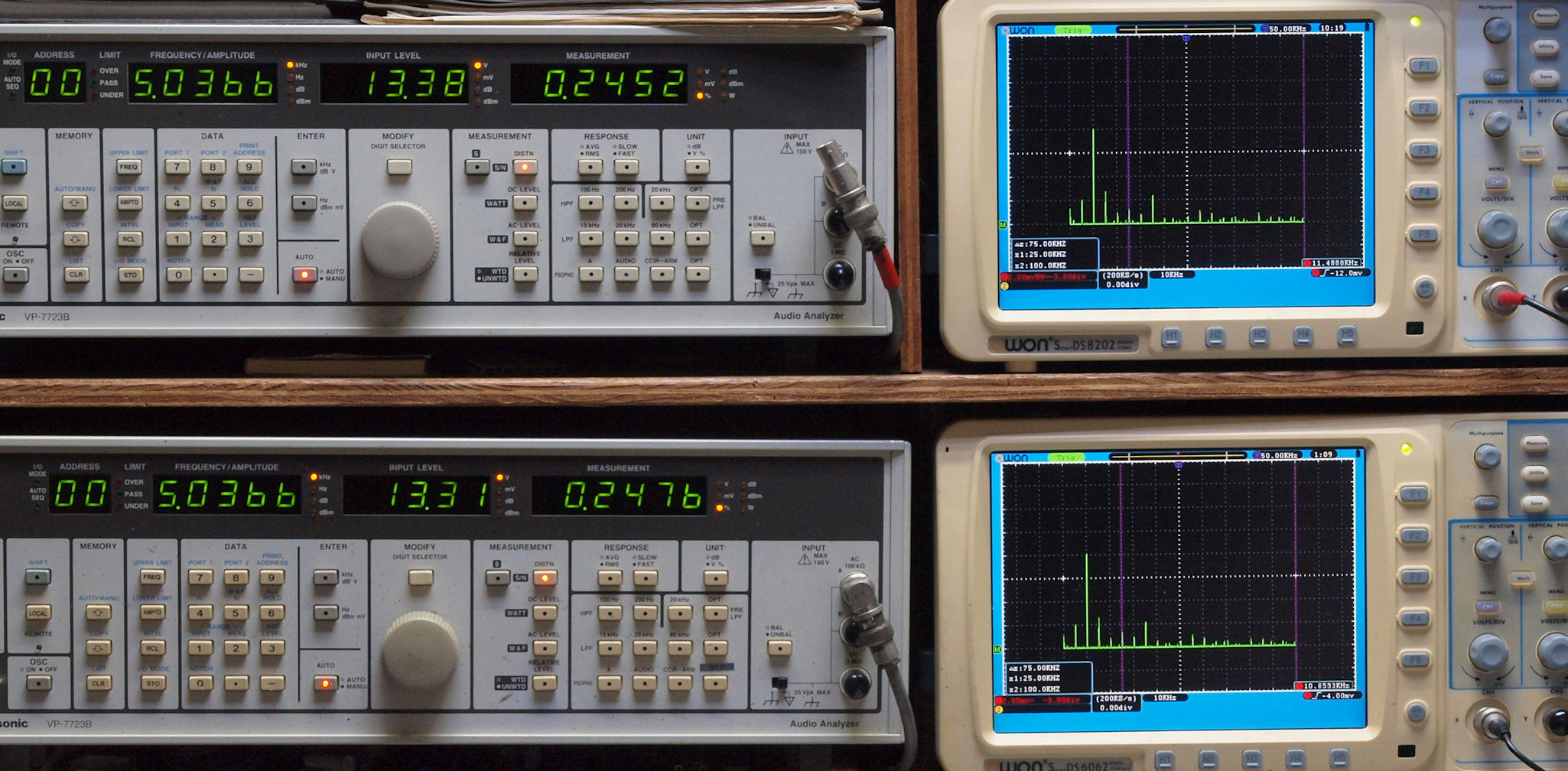 | E. 測定・調整。 画像をクリックすると、大きく(横幅2050ドット)表示されます。 E0. 出力・歪み率測定・調整 「見方」。 上段中 右側SP出力を「Audio Analyzer Panasonic VP−7723B」により測定。 表示LED、 左端=メモリーNo、 中左=周波数測定、 中右=出力電圧測定、 右端=歪み率測定。 上段右端 VP−7723Bの基本波除去出力を「owon SDS8202(200MHZ)」で「FFT分析」表示。 下段中 左側SP出力を「Audio Analyzer Panasonic VP−7723B」により測定。 表示LED、 左端=メモリーNo、 中左=周波数測定、 中右=出力電圧測定、 右端=歪み率測定。 下段右端 VP−7723Bの基本波除去出力を「owon SDS6062(200MHZ)」で「FFT分析」表示。 下段左端 オーディオ発振器 VP−7201A より50Hz〜100kHzの信号を出し(歪み率=約0.003%)、ATT+分配器を通し、AMPに入力。 よって、ダイアル設定出力レベルより低くなります。測定機器の仕様や整備の様子はこちら、「VP−7723B」「VP−7201A」。 FFT画面の見方はこちら。 |