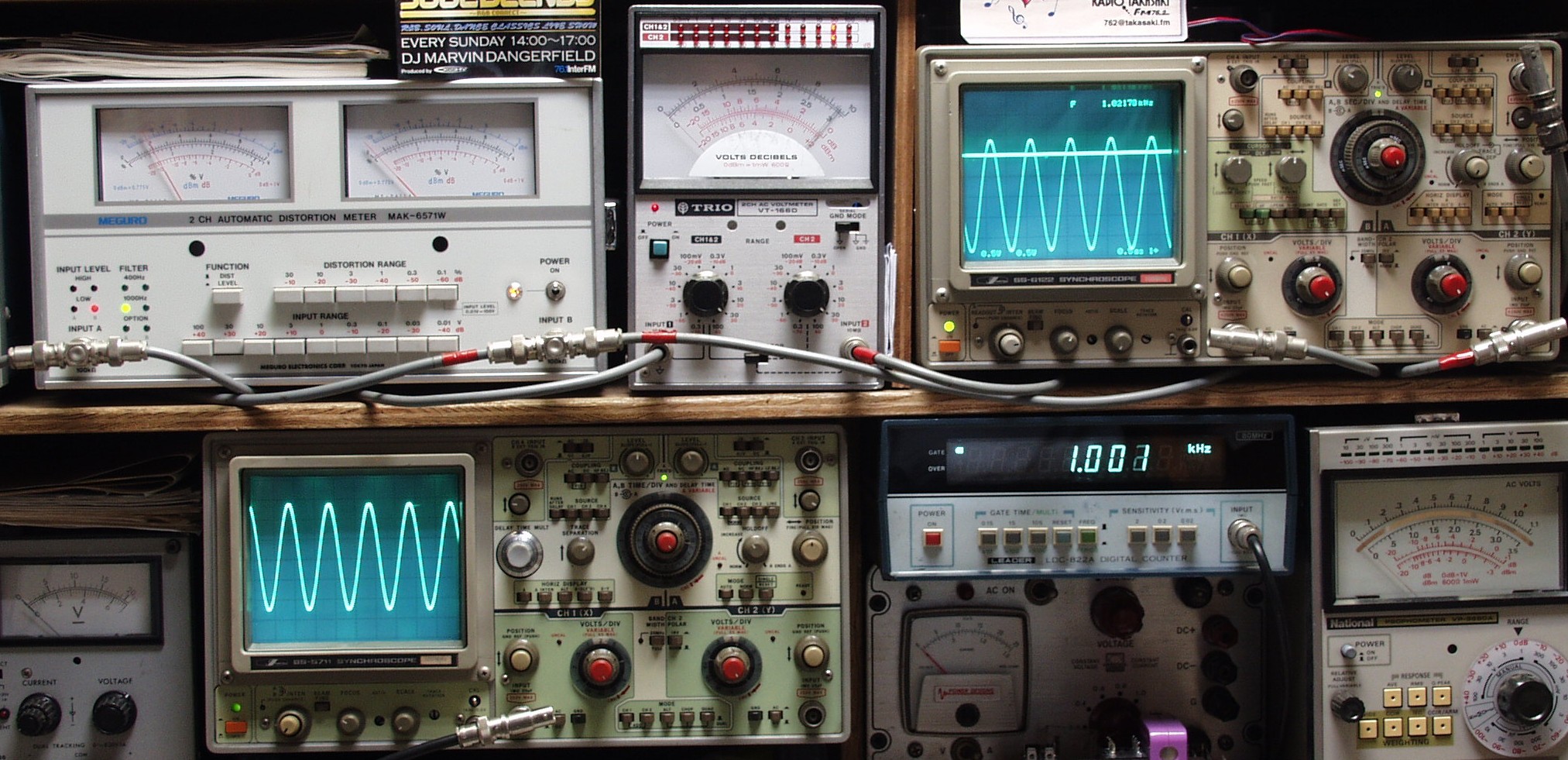 | E. 調整・測定 E1. 出力、歪み調整・測定 電源電圧は100Vにて測定 <見方> 下左のオーディオ発振器より400HZ & 1KHZの信号を出す(歪み率=約0.003%) 下中の測定器−−入力波形(オーディオ発振器のTTLレベル) 下右の測定器−−周波数計 上左の測定器−−SP出力の歪み率測定。 左メータ=Left出力。 右メータ=Right出力 上中の測定器−−SP出力電圧測定器。 赤針=Right出力。 黒針=Left出力 上右の測定器−−SP出力波形オシロ。 上=Right出力。 下=Left出力(出力電圧測定器の出力) |