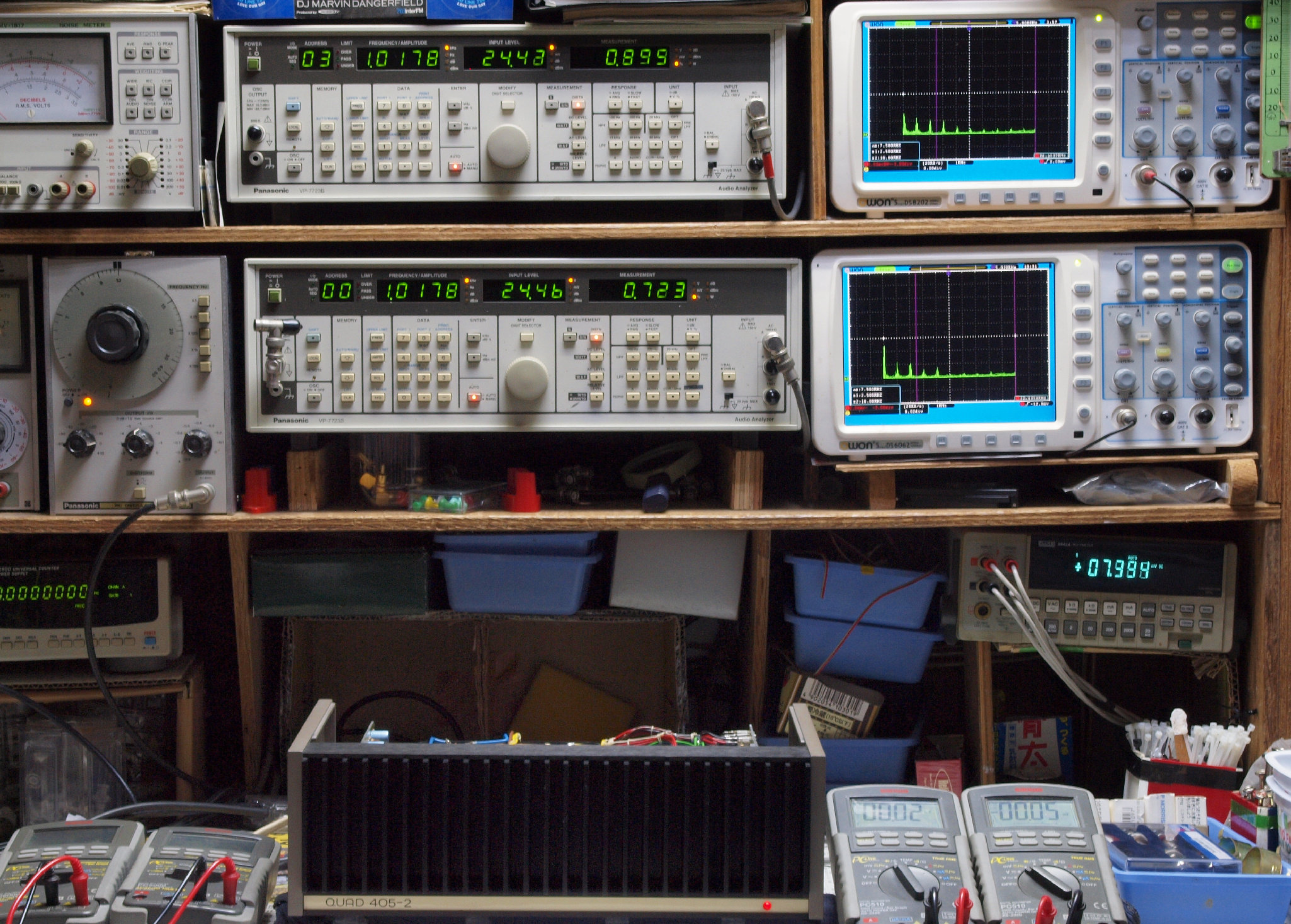 | E. 測定・調整。 画像をクリックすると、大きく(横幅2050ドット)表示されます。 E1. 出力・歪み率測定・調整 「見方」。 上段中 右側SP出力を「Audio Analyzer Panasonic VP−7723B」により測定。 表示LED、 左端=メモリーNo、 中左=周波数測定、 中右=出力電圧測定、 右端=歪み率測定。 上段右端 VP−7723Bの基本波除去出力を「owon SDS8202(200MHZ)」で「FFT分析」表示。 下段中 左側SP出力を「Audio Analyzer Panasonic VP−7723B」により測定。 表示LED、 左端=メモリーNo、 中左=周波数測定、 中右=出力電圧測定、 右端=歪み率測定。 下段右端 VP−7723Bの基本波除去出力を「owon SDS6062(200MHZ)」で「FFT分析」表示。 下段左端 オーディオ発振器 VP−7201A より50Hz〜100kHzの信号を出し(歪み率=約0.003%)、ATT+分配器を通し、AMPに入力。 よって、ダイアル設定出力レベルより低くなります。測定機器の仕様や整備の様子はこちら、「VP−7723B」「VP−7201A」。 FFT画面の見方はこちら。 |