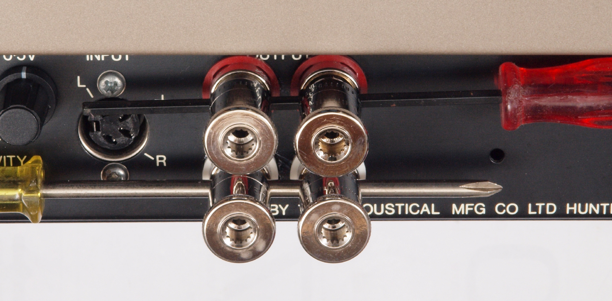 | A52. 点検中 WBT製RCA端子。 複雑な構造で「カチ」と差し込み感を与える。 | ||||||||||||||||||||||||||||||||||