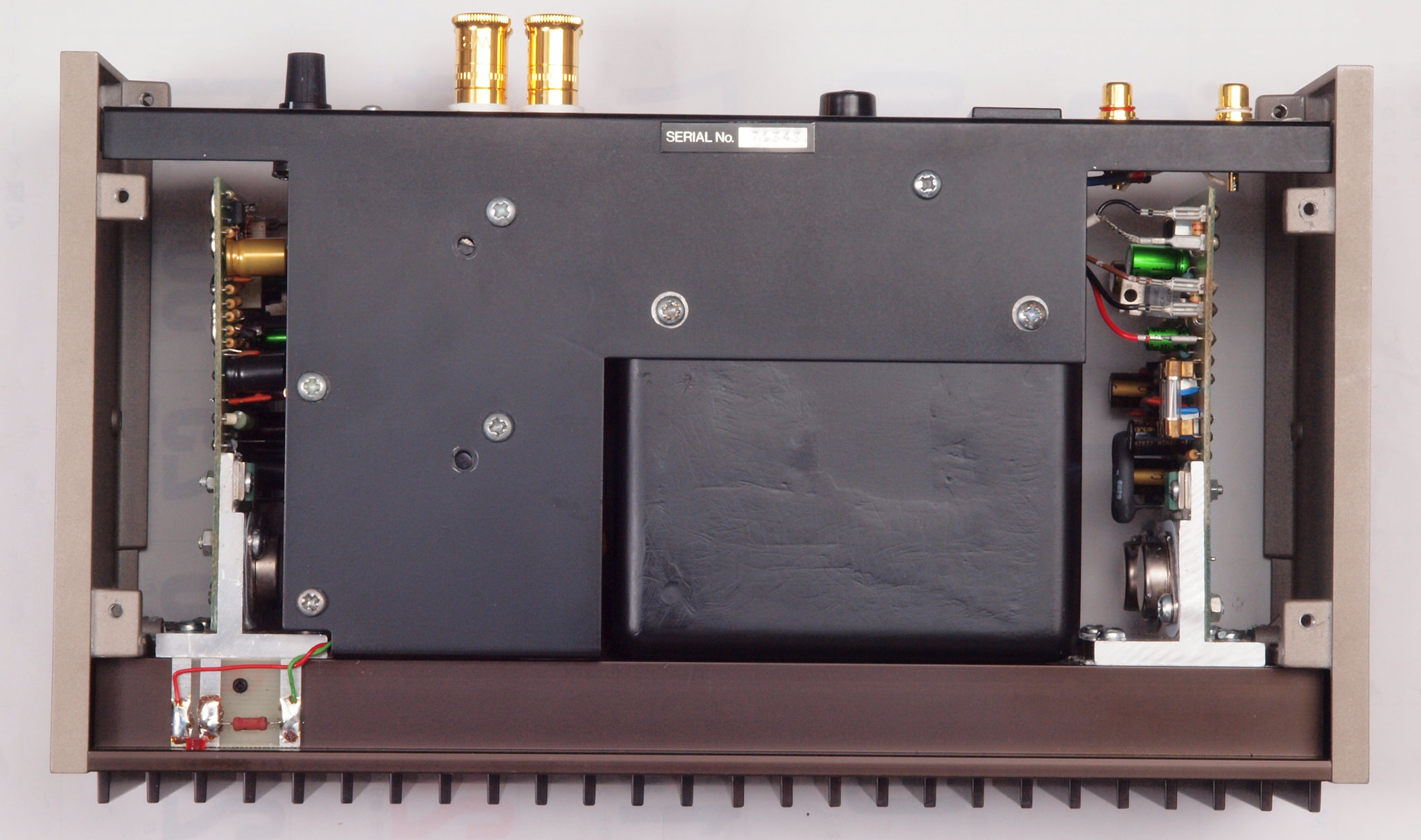 | C112. 修理中 R側 終段トランジスター。 熱でシリコングリスが堅い、テフロンシートに交換する。 | ||||||||||||||||||||||||||||||||||