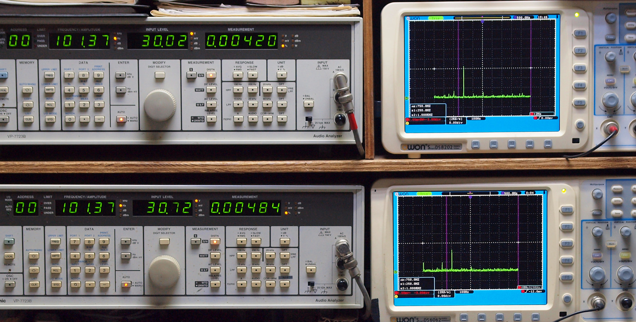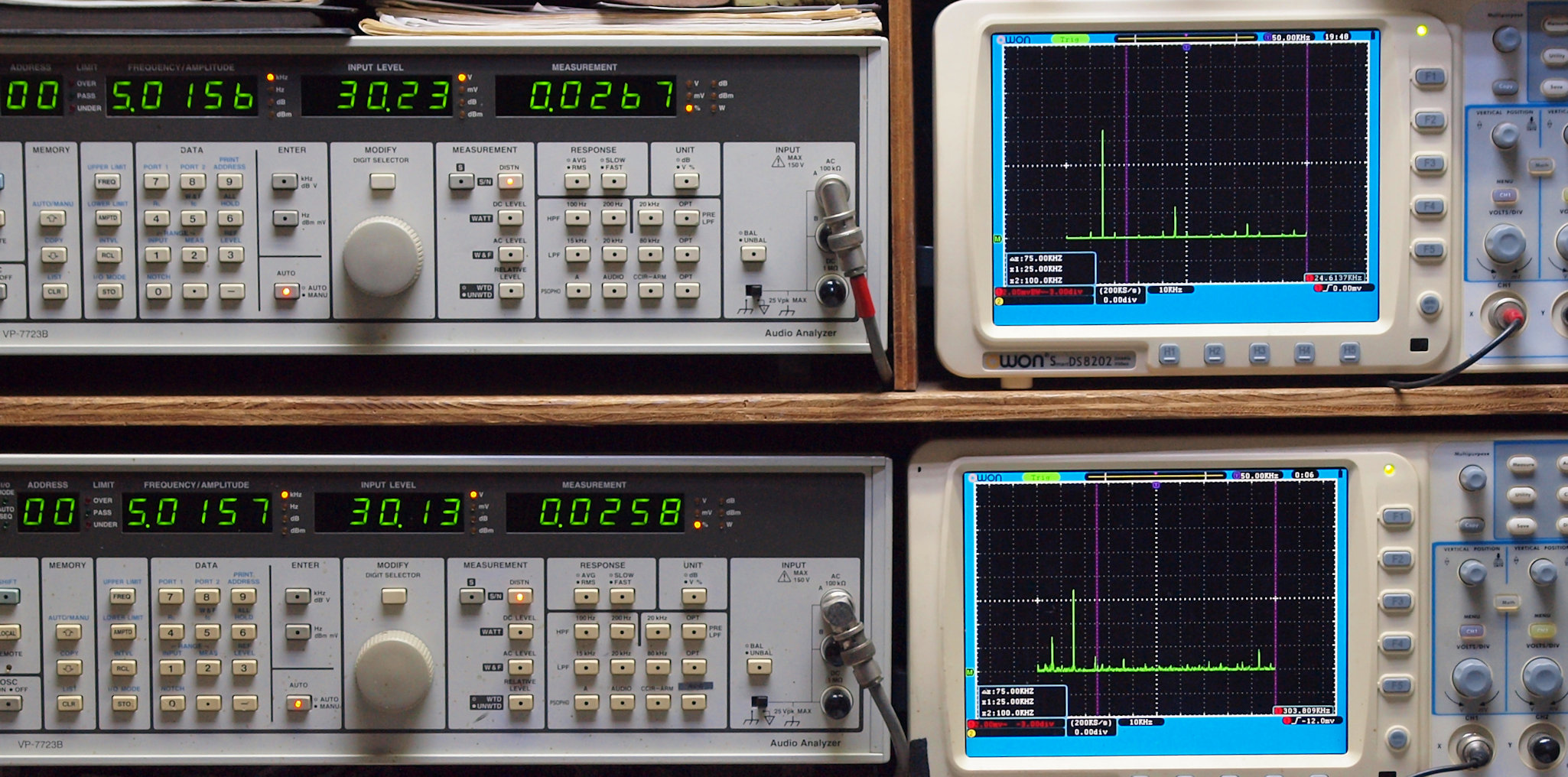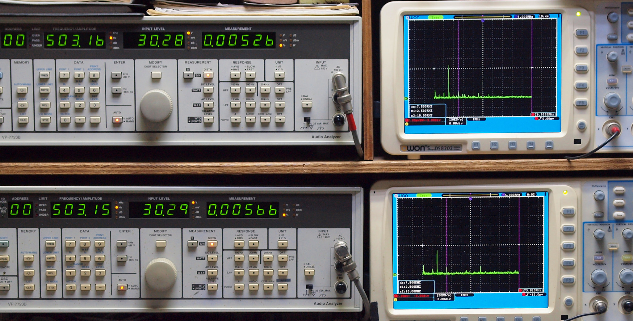 | E. 測定・調整。 画像をクリックすると、大きく(横幅2050ドット)表示されます。 E1. 出力・歪み率測定・調整 「見方」。 上段中 右側SP出力を「Audio Analyzer Panasonic VP−7723B」により測定。 表示LED、 左端=メモリーNo、 中左=周波数測定、 中右=出力電圧測定、 右端=歪み率測定。 上段右端 VP−7723Bの基本波除去出力を「owon SDS8202(200MHZ)」で「FFT分析」表示。 下段中 左側SP出力を「Audio Analyzer Panasonic VP−7723B」により測定。 表示LED、 左端=メモリーNo、 中左=周波数測定、 中右=出力電圧測定、 右端=歪み率測定。 下段右端 VP−7723Bの基本波除去出力を「owon SDS6062(200MHZ)」で「FFT分析」表示。 下段左端 オーディオ発振器 VP−7201A より50Hz〜100kHzの信号を出し(歪み率=約0.003%)、ATT+分配器を通し、AMPに入力。 よって、ダイアル設定出力レベルより低くなります。測定機器の仕様や整備の様子はこちら、「VP−7723B」「VP−7201A」。 FFT画面の見方はこちら。 |