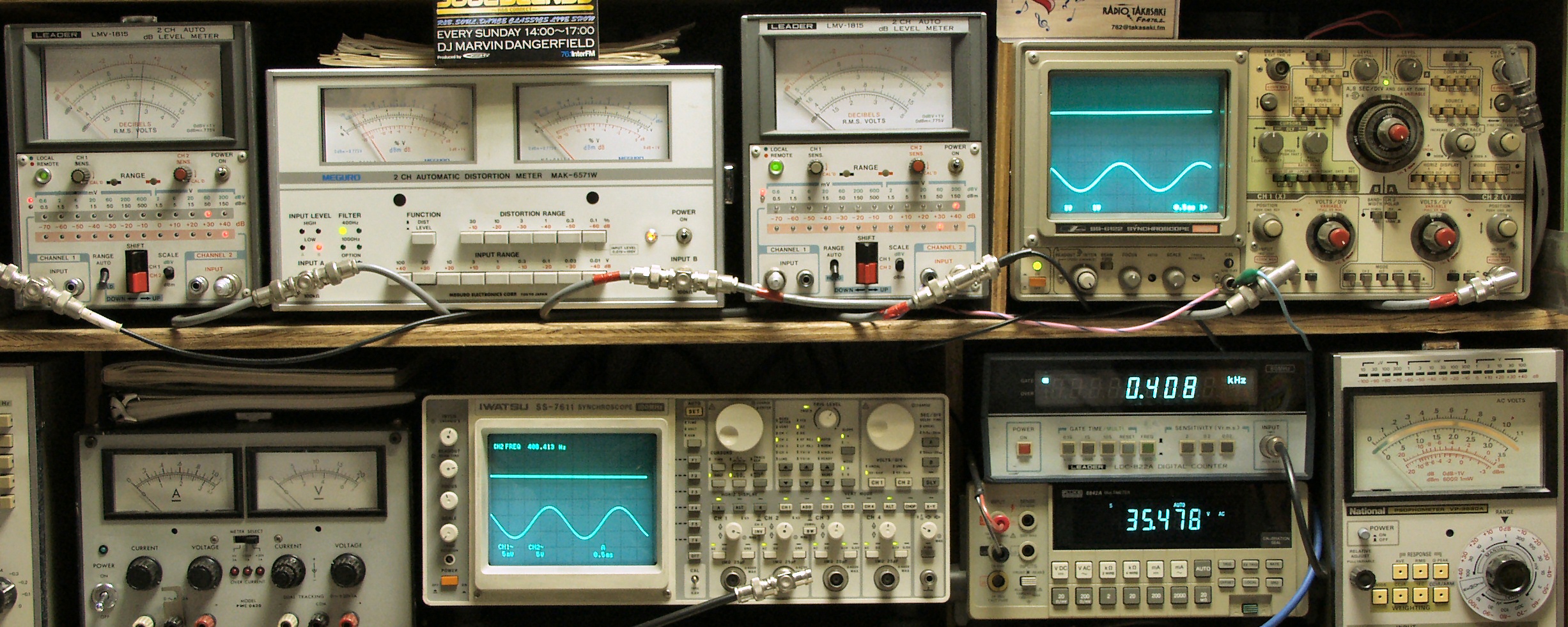 | AE. 修理前の測定 AE1. 出力・歪み率測定 <見方> 下段左端 オーディオ発振器より400HZ・1KHZの信号を出し(歪み率=約0.003%)これをAMPに入力し、出力を測定 下段中左 オシロ=入力波形(オーディオ発振器のTTLレベル) 下段中右上=周波数計 上段左端 電圧計=L側出力電圧測定、黒針のみ使用 上段中左 歪み率計=出力の歪み率測定 左メータ=L出力、右メータ=R出力 上段中右 電圧計=R側出力電圧測定、赤針のみ使用 上段右端 オシロ=出力波形 上=R出力、下=L出力(実際にはRL電圧計の出力「Max=1V」を観測) 下段中右上 デジタル電圧計=出力電圧測定RLは切り替えて測定 下段左端 電圧計=入力電圧測定 |