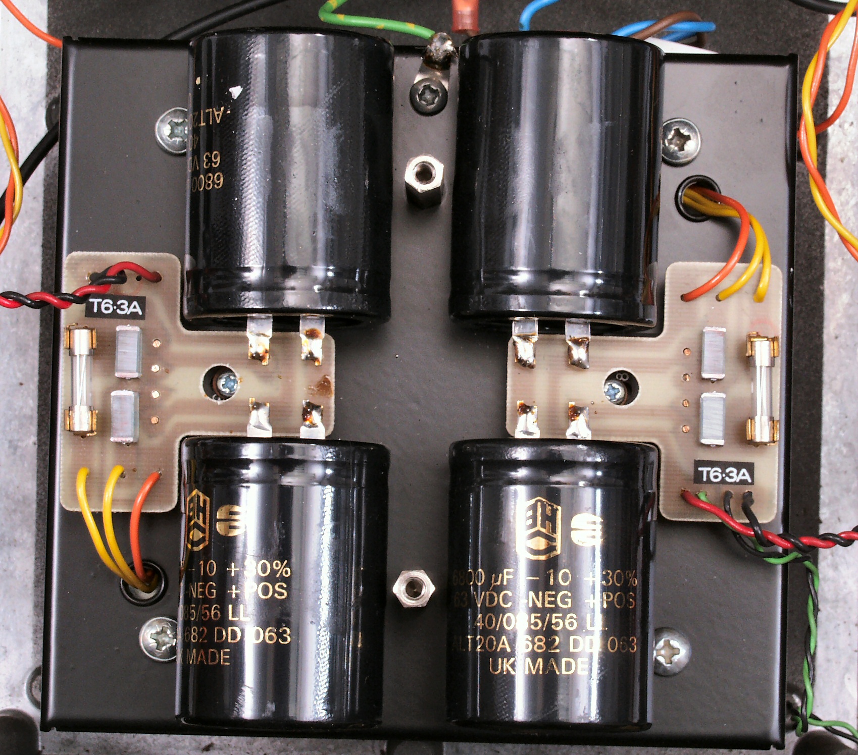 | A5. 点検中 電源整流電解コンデンサー比較。 上=付いていた物6800μ/63WV、下=新しく交換物10000μ/63WV。 | ||||||||||||||||||||||||||||