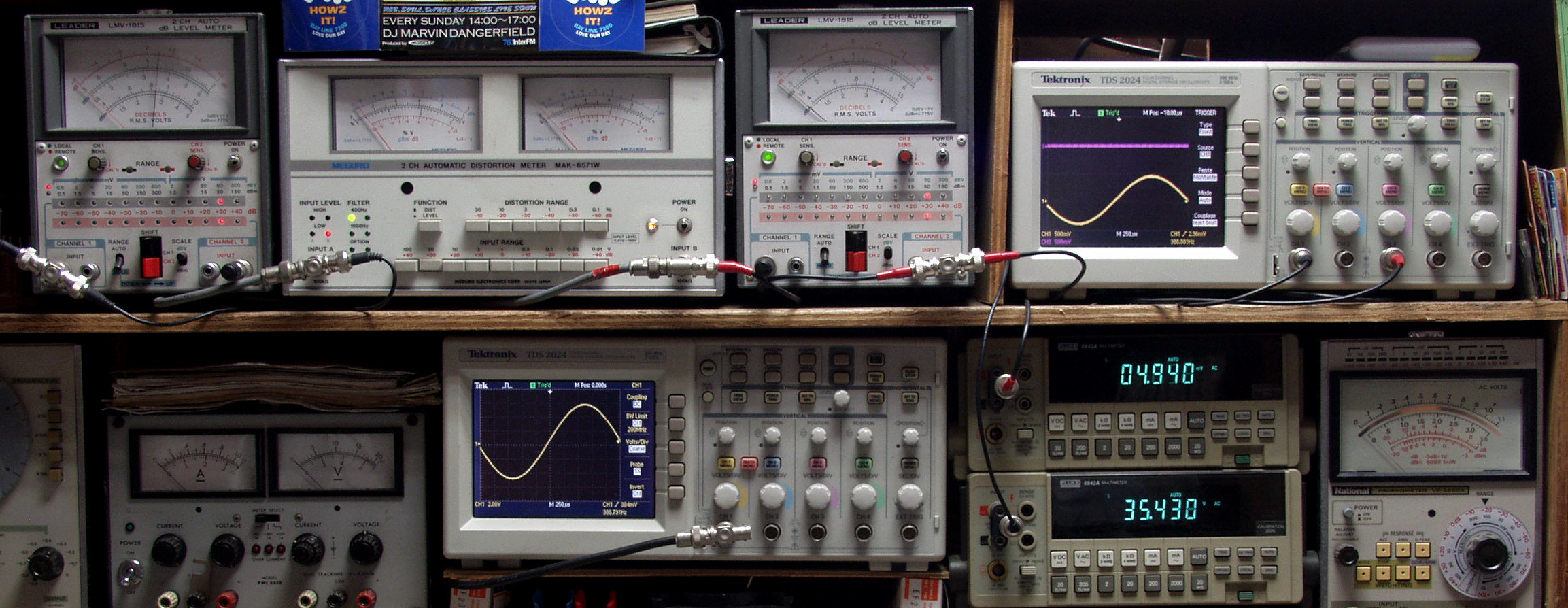 | E. 修理前の測定 E1. 出力・歪み率測定 <見方> 下段左端 オーディオ発振器より400HZ・1KHZの信号を出し(歪み率=約0.003%)これをAMPに入力し、出力を測定 下段中左 オシロ=入力波形(オーディオ発振器のTTLレベル) 下段中右上=周波数計 上段左端 電圧計=L側出力電圧測定、黒針のみ使用 上段中左 歪み率計=出力の歪み率測定 左メータ=L出力、右メータ=R出力 上段中右 電圧計=R側出力電圧測定、赤針のみ使用 上段右端 オシロ=出力波形 上=R出力、下=L出力(実際にはRL電圧計の出力「Max=1V」を観測) 下段中右上 デジタル電圧計=出力電圧測定RLは切り替えて測定 |