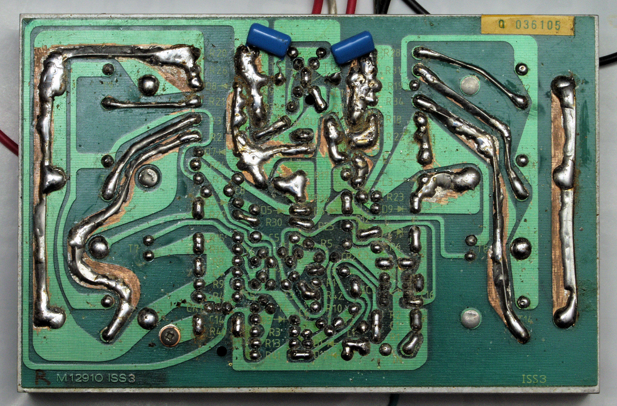 | C13. 修理前 R側AMP基板裏、銅箔が補強されている。 | ||||||||||||||||||||||||||||