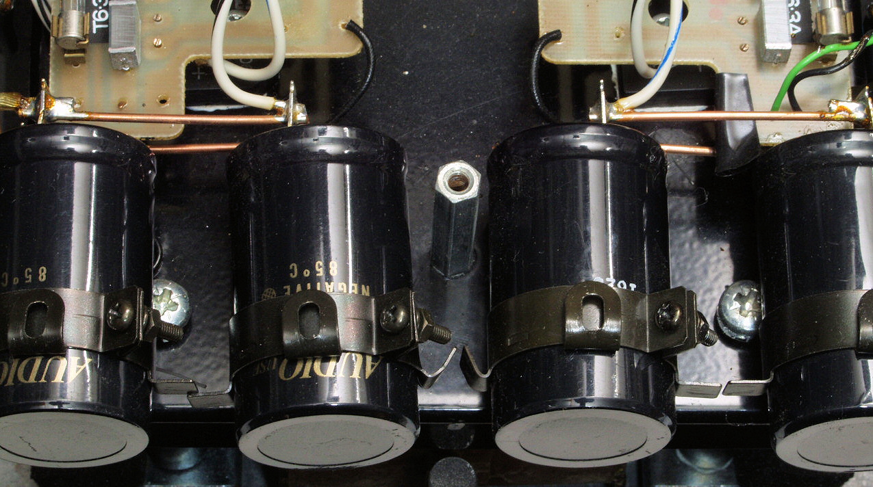 | C32. 修理前 配置が悪く、電源シャーシ、整流器から電解コンデンサーへの配線が長くなっている! 後の修理の操作性を犠牲にして、電源・SP出力端子の引出し線を半田付けしたり、電源配線を太くした、意味が無くなる |