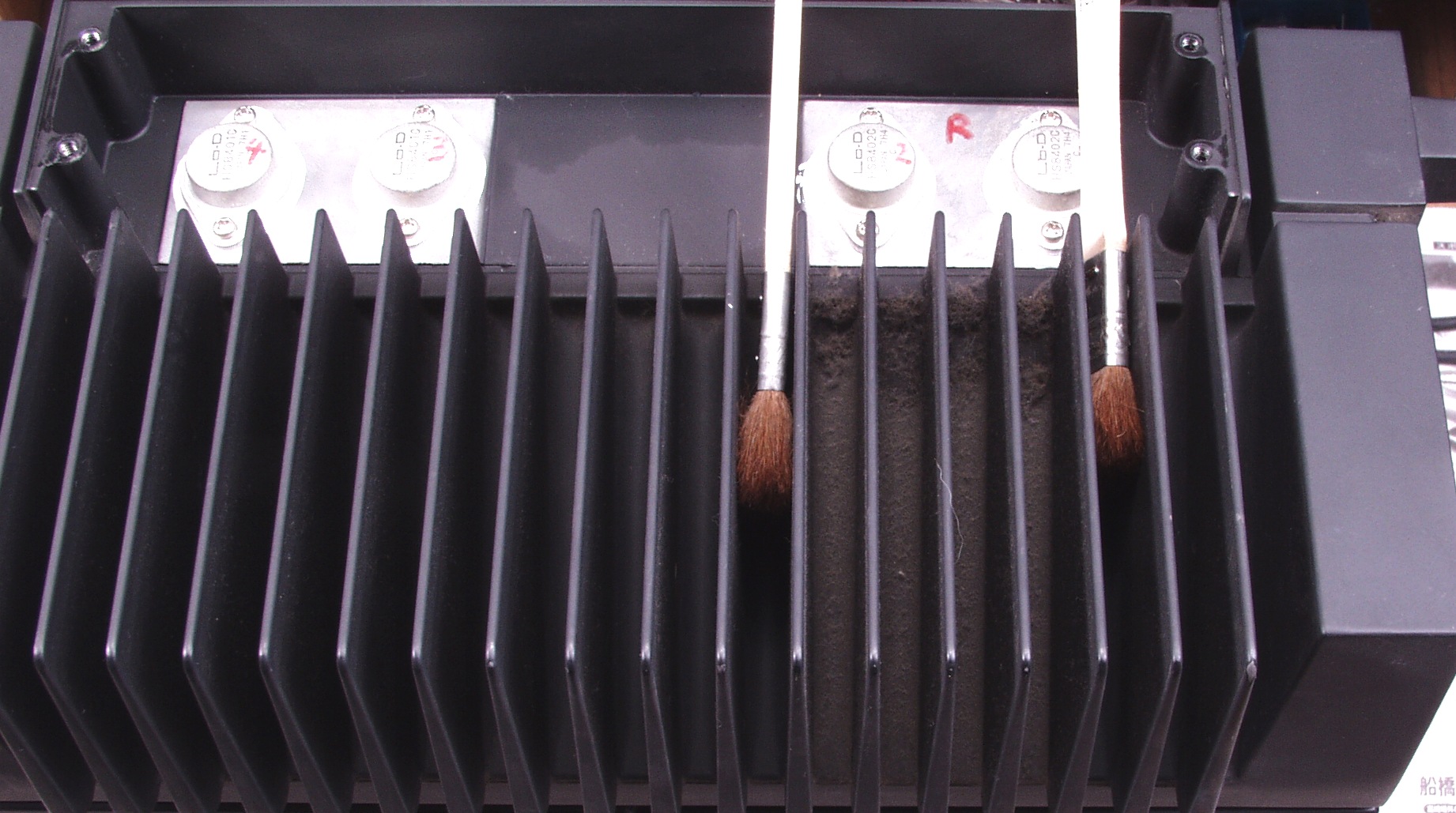 | A4A. 修理前見積り点検中 R側放熱器の埃、刷毛で取ると良い、刷毛の間が未掃除 |