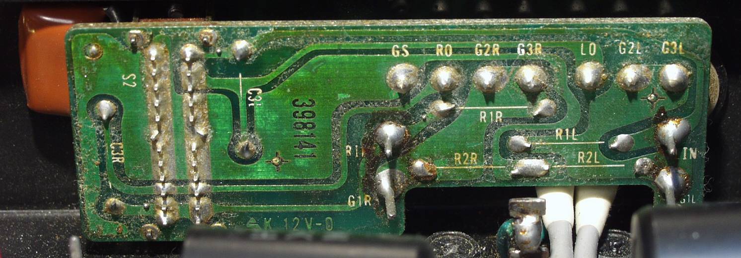 | C−5B. 修理(半田補正)後 入力RCA基盤裏 全ての半田をやり修す フイルムコンデンサー2個追加 |