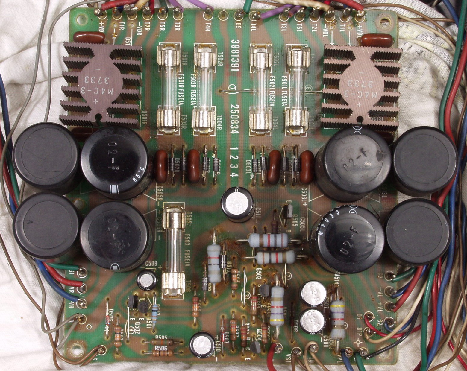 | C3B. 修理後 電源基盤 フューズ入り抵抗全部、電解コンデンサー9個交換 ジャンパー線も半田を浸み込ませる |