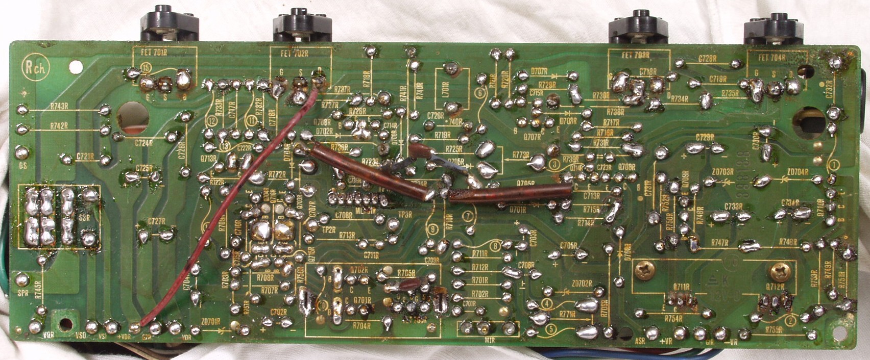 | C1E. 修理完成後 Rドライブ基板裏 不要なフラックスを削り落とし、洗浄後。 「フラックス」=半田を付ける為に、事前に塗る物、松ヤニが元祖ですが、現在は化学合成が殆ど |