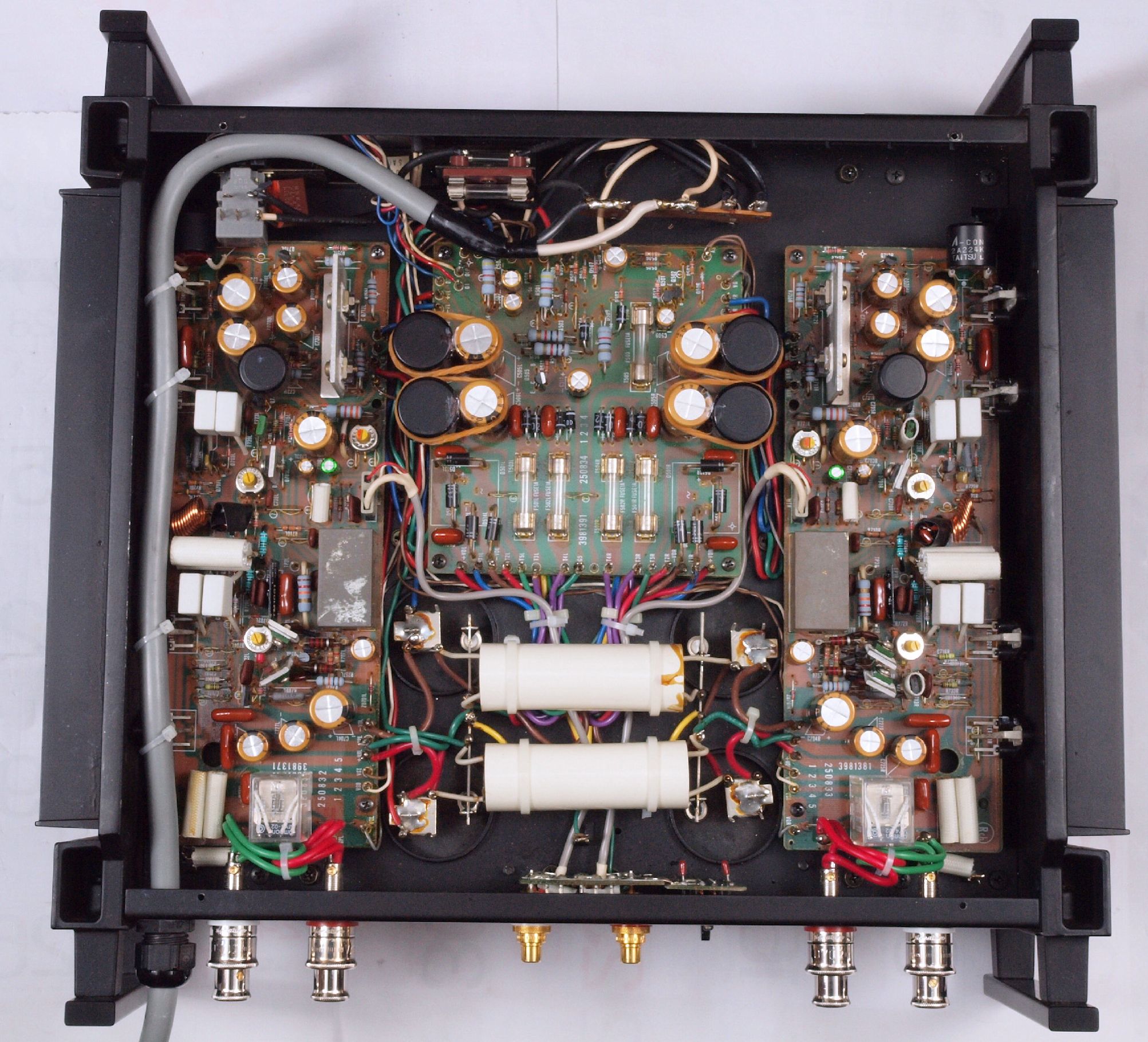 | 注意 このAMPはアースラインが浮いています。 AMPのシャーシにSPの線(アース側)やプリAMPのアースもも接続してはいけません。 RL−SPのアース線も接続(共通)してもいけません、+−の撚りのあるのも使用出来ません。 又、DC(directconnection)入力が可能ですが、絶対に使用しないこと=ここ参照 |