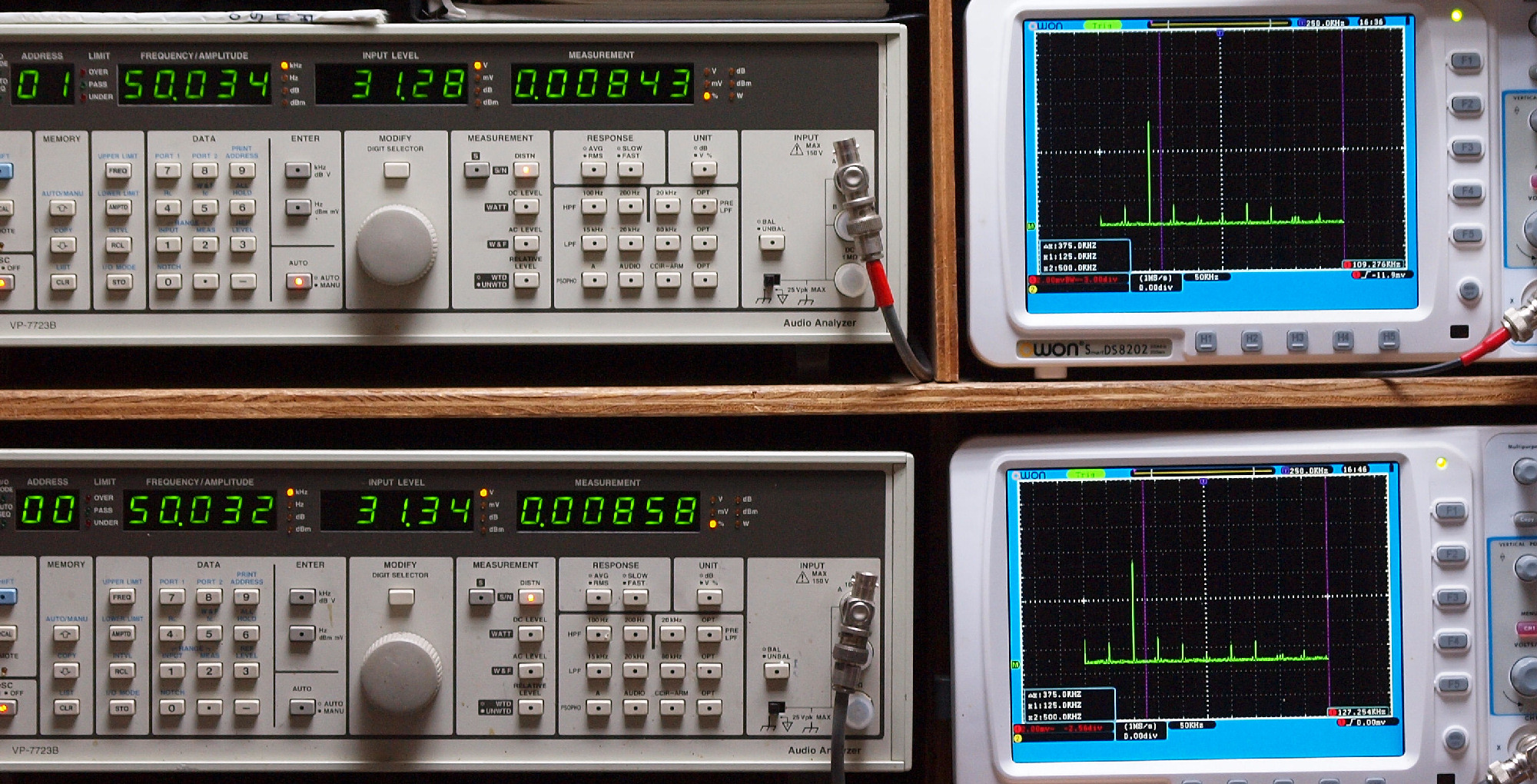 | E. 測定・調整 E1. 出力・歪み率測定・調整 「見方」。 上段中 右側SP出力を「Audio Analyzer Panasonic VP−7723B」により測定。 表示LED、 左端=メモリーNo、 中左=周波数測定、 中右=出力電圧測定、 右端=歪み率測定。 上段右端 VP−7723Bの基本波除去出力を「owon SDS8202(200MHZ)」で「FFT分析」表示。 下段中 左側SP出力を「Audio Analyzer Panasonic VP−7723B」により測定。 表示LED、 左端=メモリーNo、 中左=周波数測定、 中右=出力電圧測定、 右端=歪み率測定。 下段右端 VP−7723Bの基本波除去出力を「owon SDS6062(200MHZ)」で「FFT分析」表示。 下段左端 オーディオ発振器 VP−7201A より50Hz〜100kHzの信号を出し(歪み率=約0.003%)、ATT+分配器を通し、AMPに入力。 よって、ダイアル設定出力レベルより低くなります。測定機器の仕様や整備の様子はこちら、「VP−7723B」「VP−7201A」。 FFT画面の見方はこちら。 |