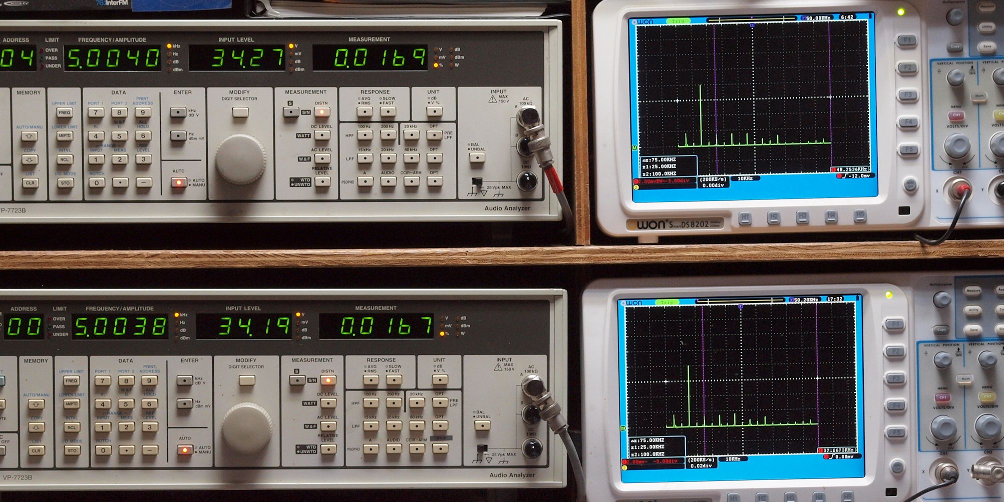 | E. 測定・調整 E1. 出力・歪み率測定・調整 「見方」。 上段中 右側SP出力を「Audio Analyzer Panasonic VP−7723B」により測定。 表示LED、 左端=メモリーNo、 中左=周波数測定、 中右=出力電圧測定、 右端=歪み率測定。 上段右端 VP−7723Bの基本波除去出力を「owon SDS8202(200MHZ)」で「FFT分析」表示。 下段中 左側SP出力を「Audio Analyzer Panasonic VP−7723B」により測定。 表示LED、 左端=メモリーNo、 中左=周波数測定、 中右=出力電圧測定、 右端=歪み率測定。 下段右端 VP−7723Bの基本波除去出力を「owon SDS6062(200MHZ)」で「FFT分析」表示。 下段左端 オーディオ発振器 VP−7201A より50Hz〜100kHzの信号を出し(歪み率=約0.003%)、ATT+分配器を通し、AMPに入力。 よって、ダイアル設定出力レベルより低くなります。測定機器の仕様や整備の様子はこちら、「VP−7723B」「VP−7201A」。 FFT画面の見方はこちら。 |