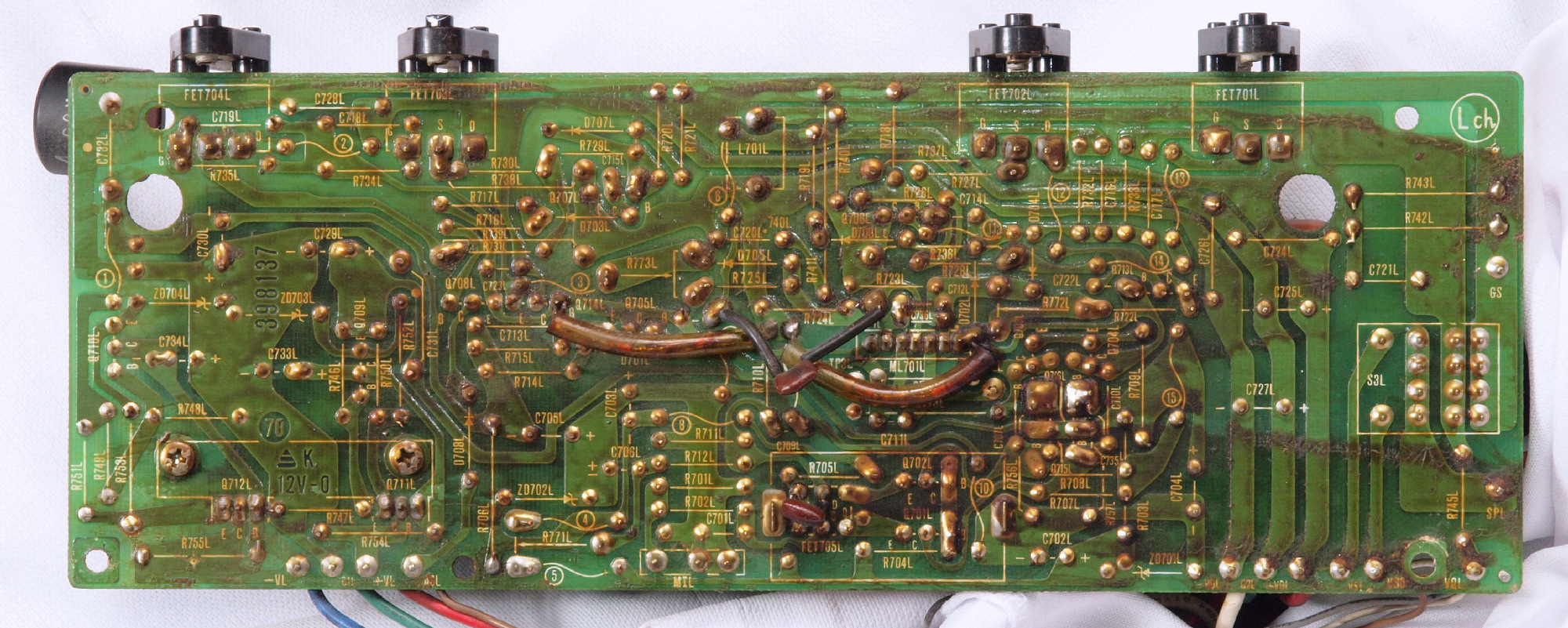 | C43. 修理後 RLモジュール裏。 TR(トランジスター)交換後軽くラッカーを吹きました。 |