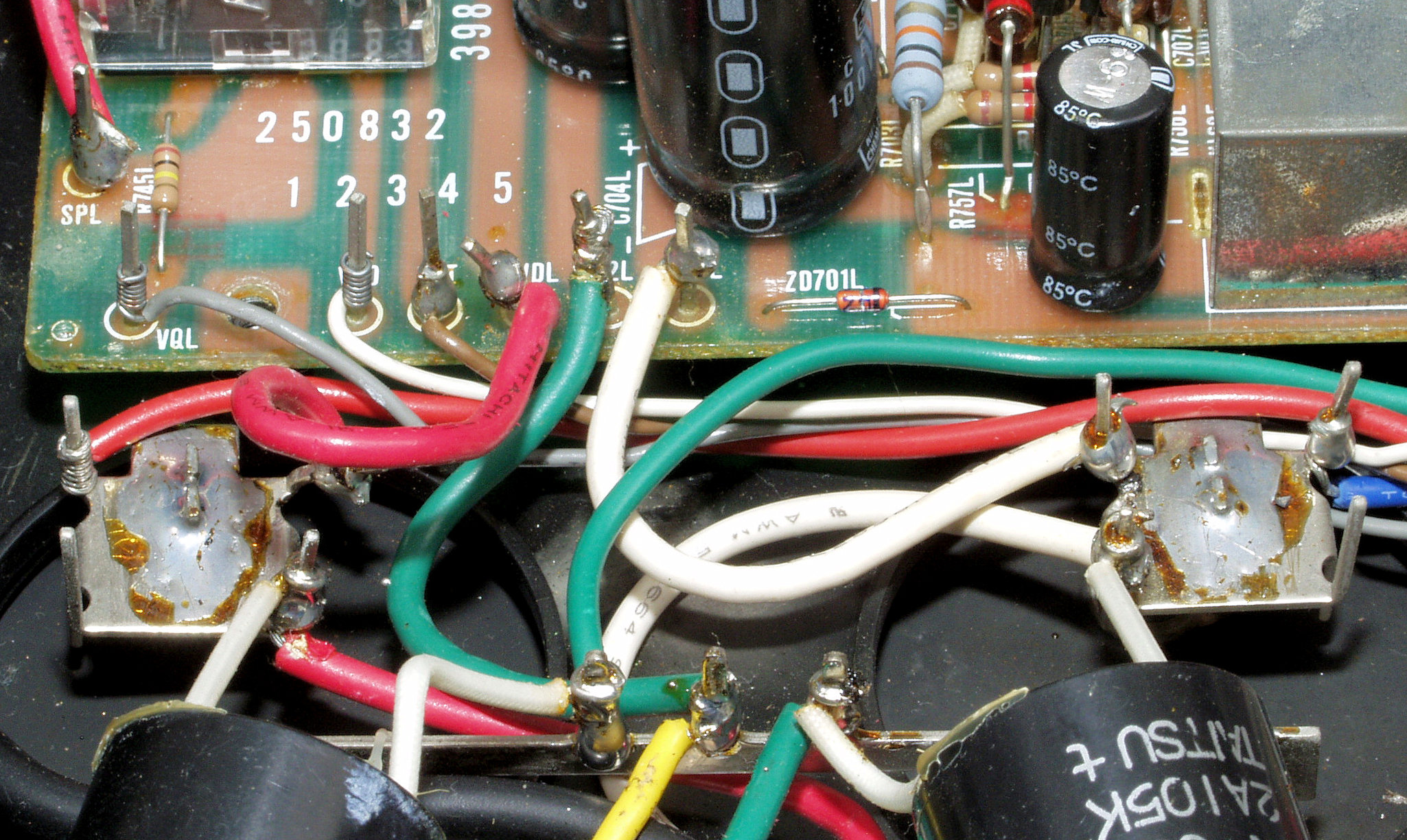 | C65. 修理(半田補正)後 RCA端子基板裏 半田を全部やり直す フイルムコンデンサー2個増設 |