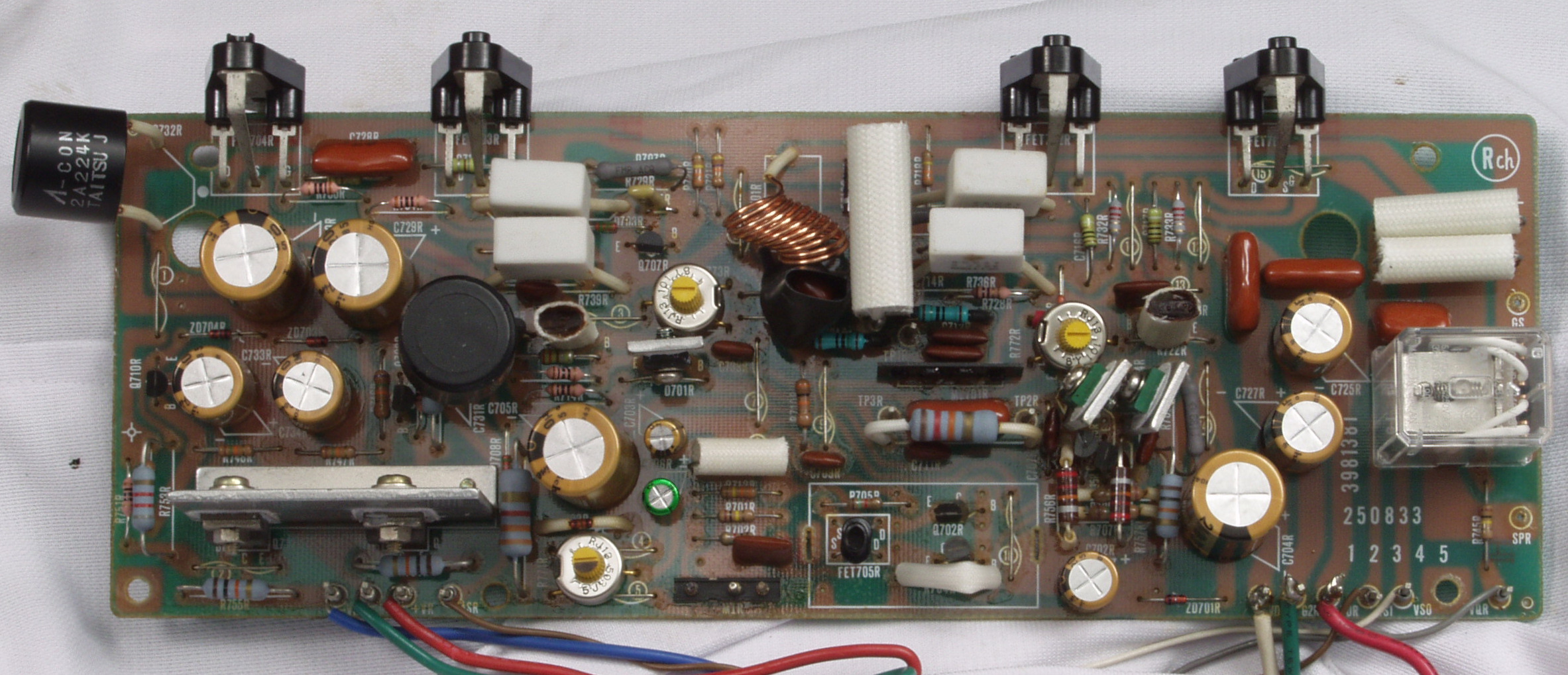 | C12. 修理後 R側ドライブ基板 初段FET(電界効果トランジスター)、バランス・バイアス調整用半固定VR3個、SP接続リレー交換 フューズ入り抵抗全部、電解コンデンサー11個交換 |