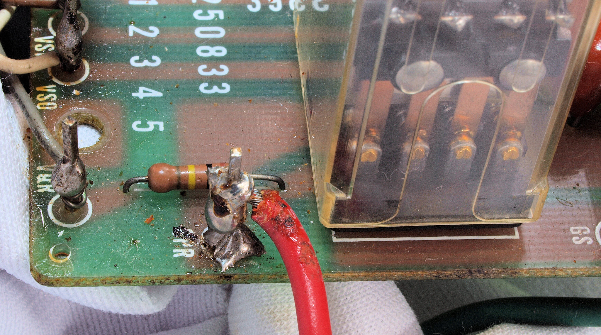 | C113. 修理中 R側ドライブ基板、 上下=大型抵抗に交換、中=正規のフューズ入り抵抗。 |