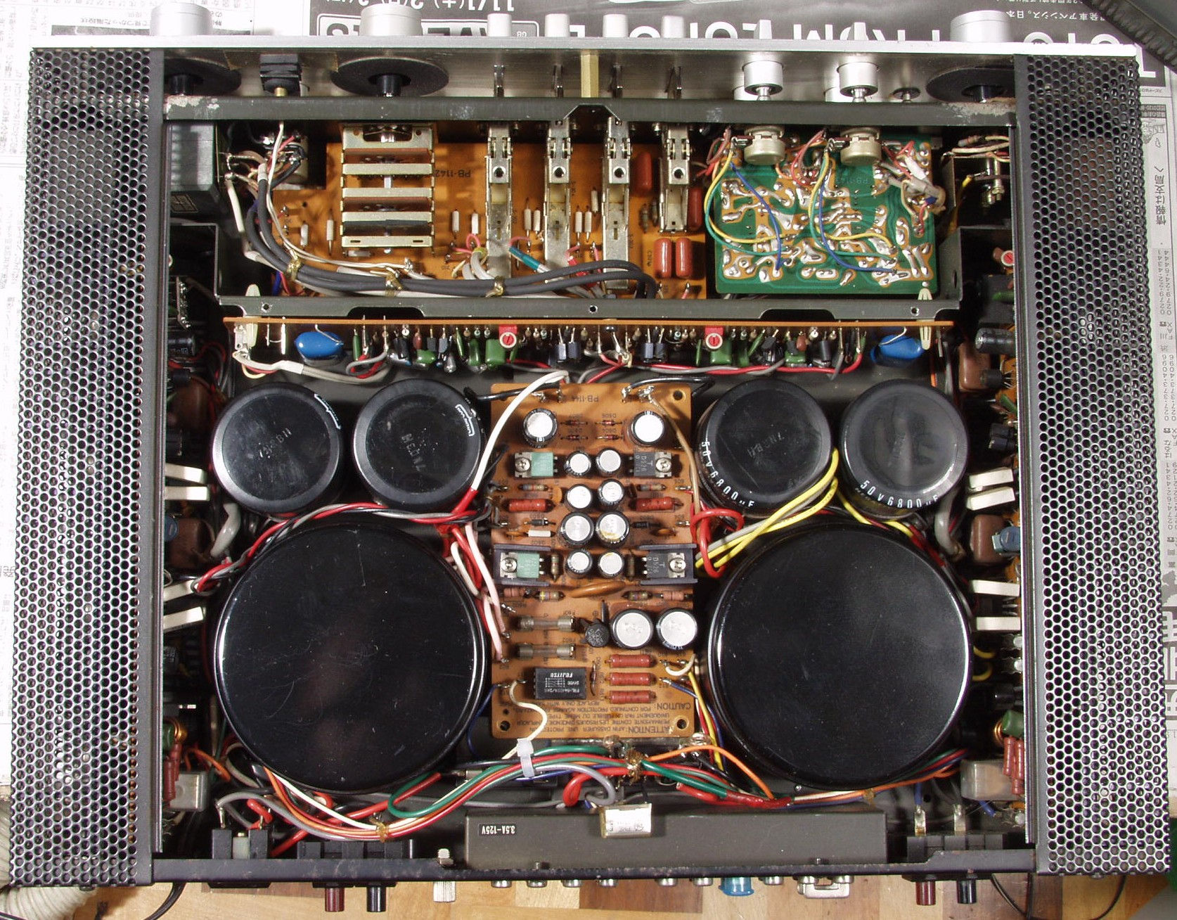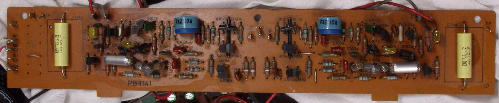 | C4B.修理後 EQ−AMP基盤 半固定VR2個、TR(トランジスタ−)12個、フイルムコンデンサー12個、FET2個交換 | ||||||||||||||||||||||||||||||||||||||