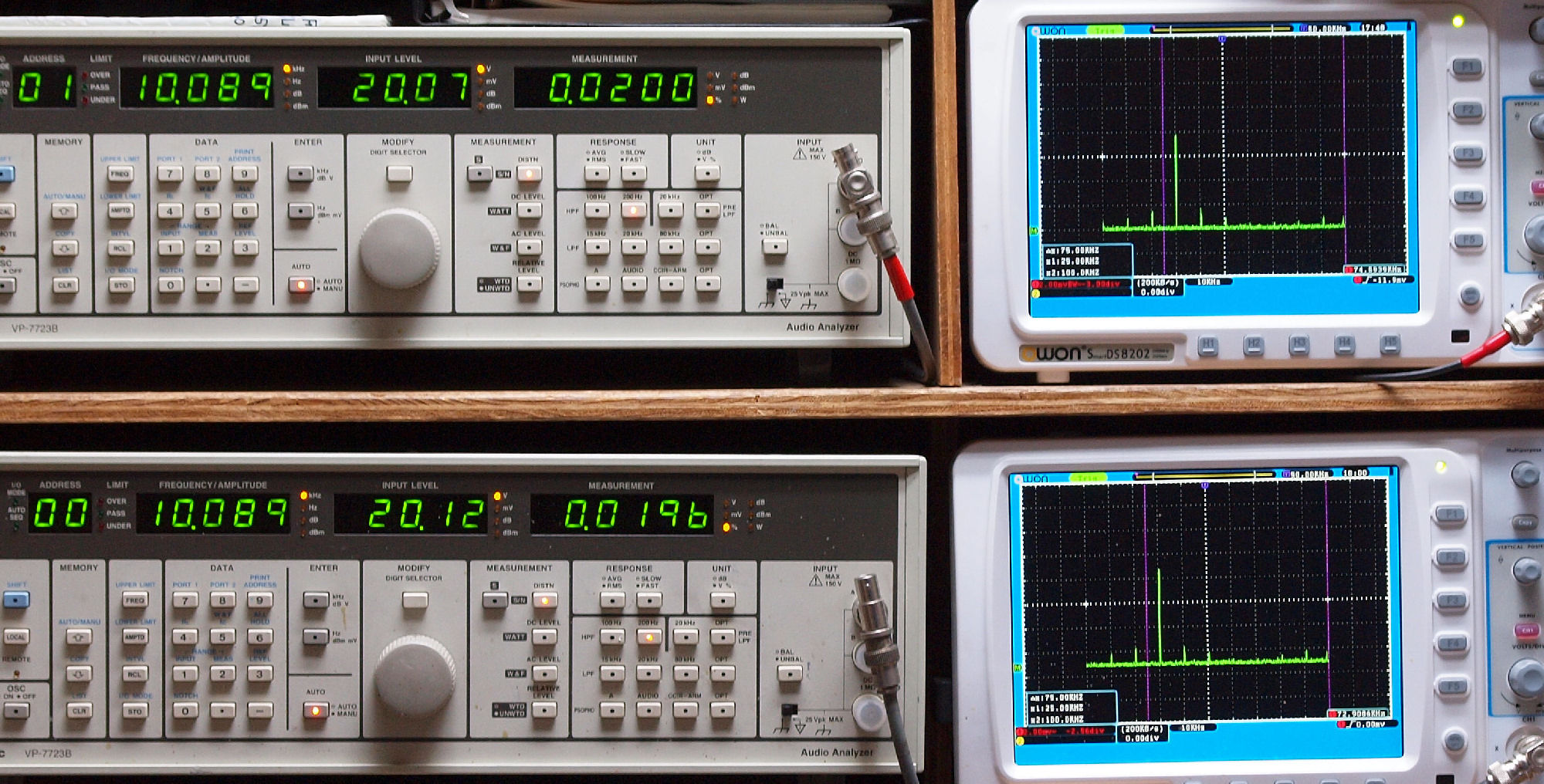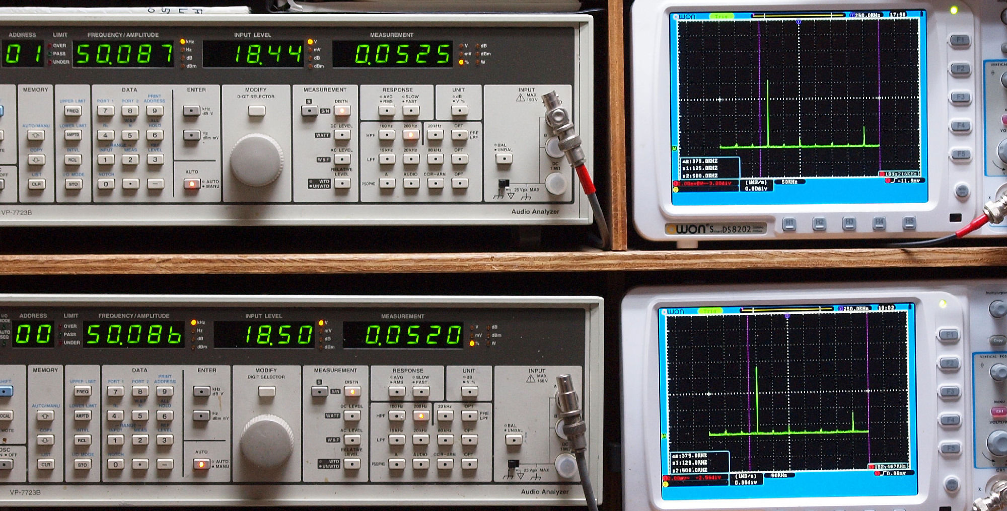 | E. 測定・調整。 画像をクリックすると、大きく(横幅2050ドット)表示されます。 E1. 出力・歪み率測定・調整 「見方」。 上段中 右側SP出力を「Audio Analyzer Panasonic VP−7723B」により測定。 表示LED、 左端=メモリーNo、 中左=周波数測定、 中右=出力電圧測定、 右端=歪み率測定。 上段右端 VP−7723Bの基本波除去出力を「owon SDS8202(200MHZ)」で「FFT分析」表示。 下段中 左側SP出力を「Audio Analyzer Panasonic VP−7723B」により測定。 表示LED、 左端=メモリーNo、 中左=周波数測定、 中右=出力電圧測定、 右端=歪み率測定。 下段右端 VP−7723Bの基本波除去出力を「owon SDS6062(200MHZ)」で「FFT分析」表示。 下段左端 オーディオ発振器 VP−7201A より50Hz〜100kHzの信号を出し(歪み率=約0.003%)、ATT+分配器を通し、AMPに入力。 よって、ダイアル設定出力レベルより低くなります。測定機器の仕様や整備の様子はこちら、「VP−7723B」「VP−7201A」。 FFT画面の見方はこちら。 |