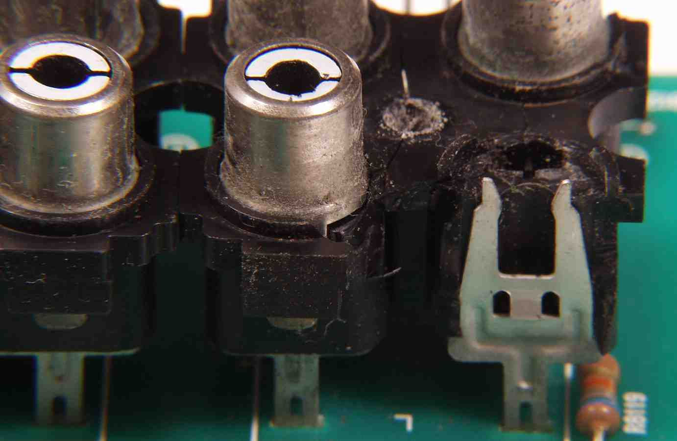 | C−7F.修理前 オーデオ入力RCA端子 現在の様に、太いケーブルの使用を想定していない | |