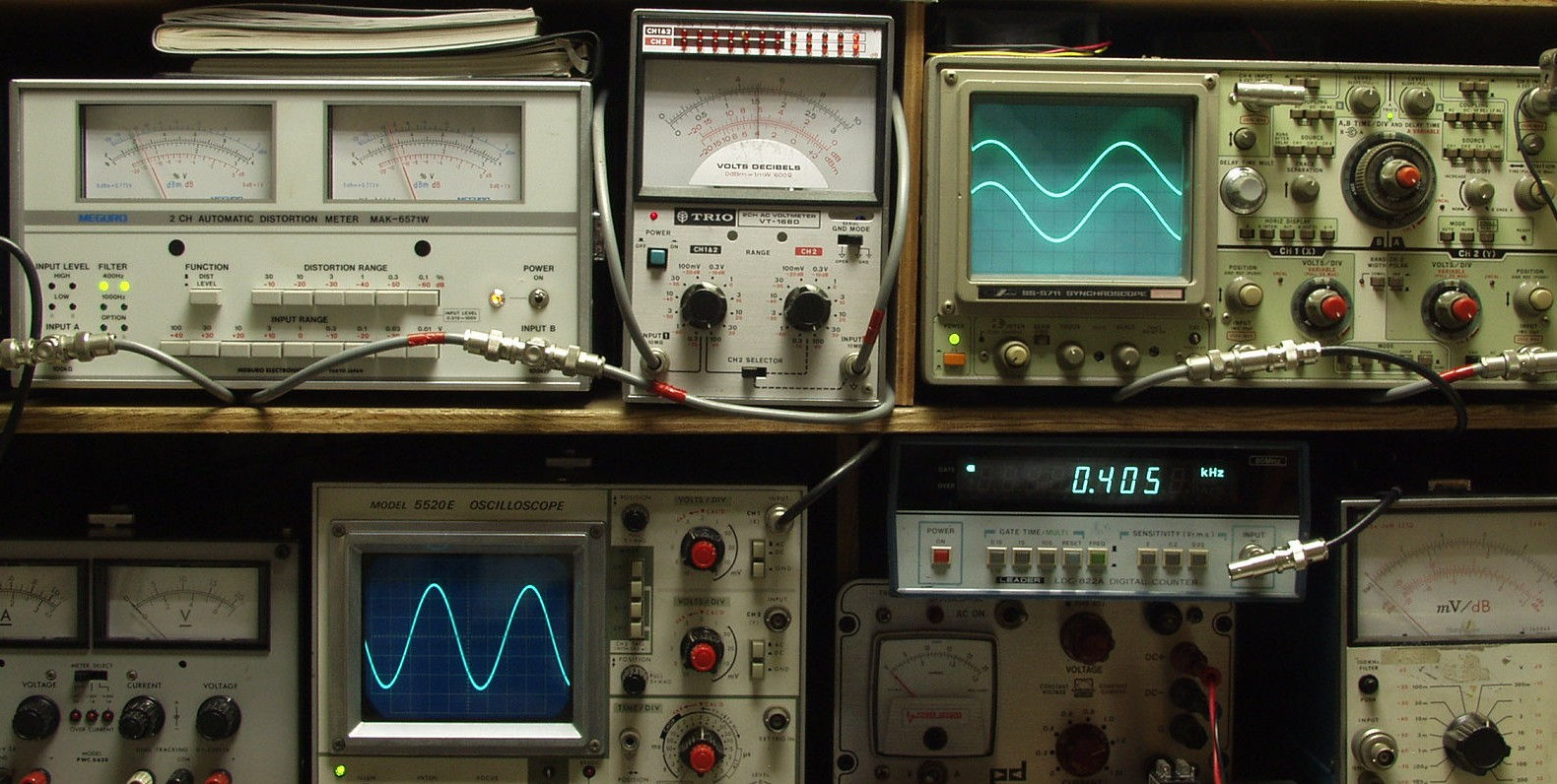 | E. 調整・測定 E1. 出力/歪み率測定・調整 <見方> 上左オーディオ発振器より400HZ&1KHZの信号を出す(歪み率=約0.003%)。 下中=入力波形(オーディオ発振器のTTLレベル)。 下右=周波数計。 上左=SP出力の歪み率測定。 左メータ=L出力。 右メータ=R出力。 上中=SP出力電圧測定器。 赤針=R出力。 黒針=L出力。 上右=SP出力波形オシロ。 上=R出力。 下=L出力(出力電圧測定器の出力)。 |