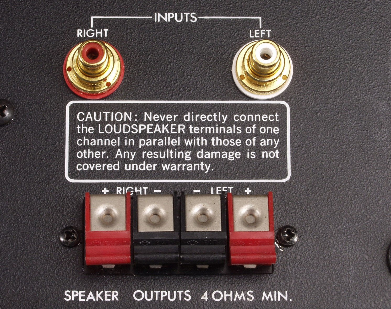 | A4. 点検中 R側、終段TR(トランジスター)が焼損で短絡し、フューズが飛んで、電源が入らない。 オークションでこのままで売ると安いので、基板の電源供給線を外し、”電源を入れると「カチ」と音がしますが、 出力しません”とすると、簡単に直ると思いこみ、高く売れる。 |