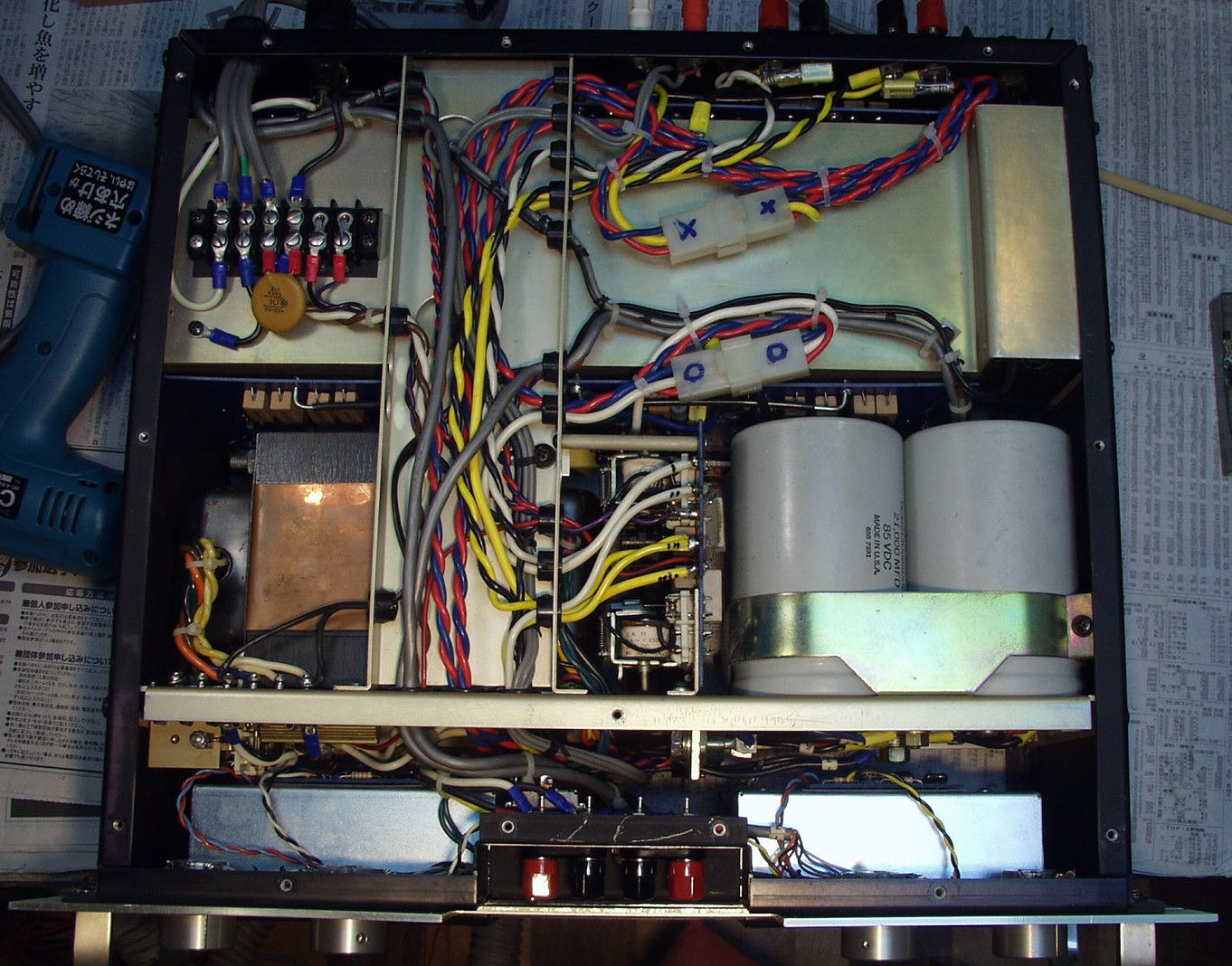 | A. 修理前の状況 A11. 修理前 上から見る。 定格出力250W8Ω/250W8Ω 大きい電解コンデンサー使用、容量は21000μ×4個 |