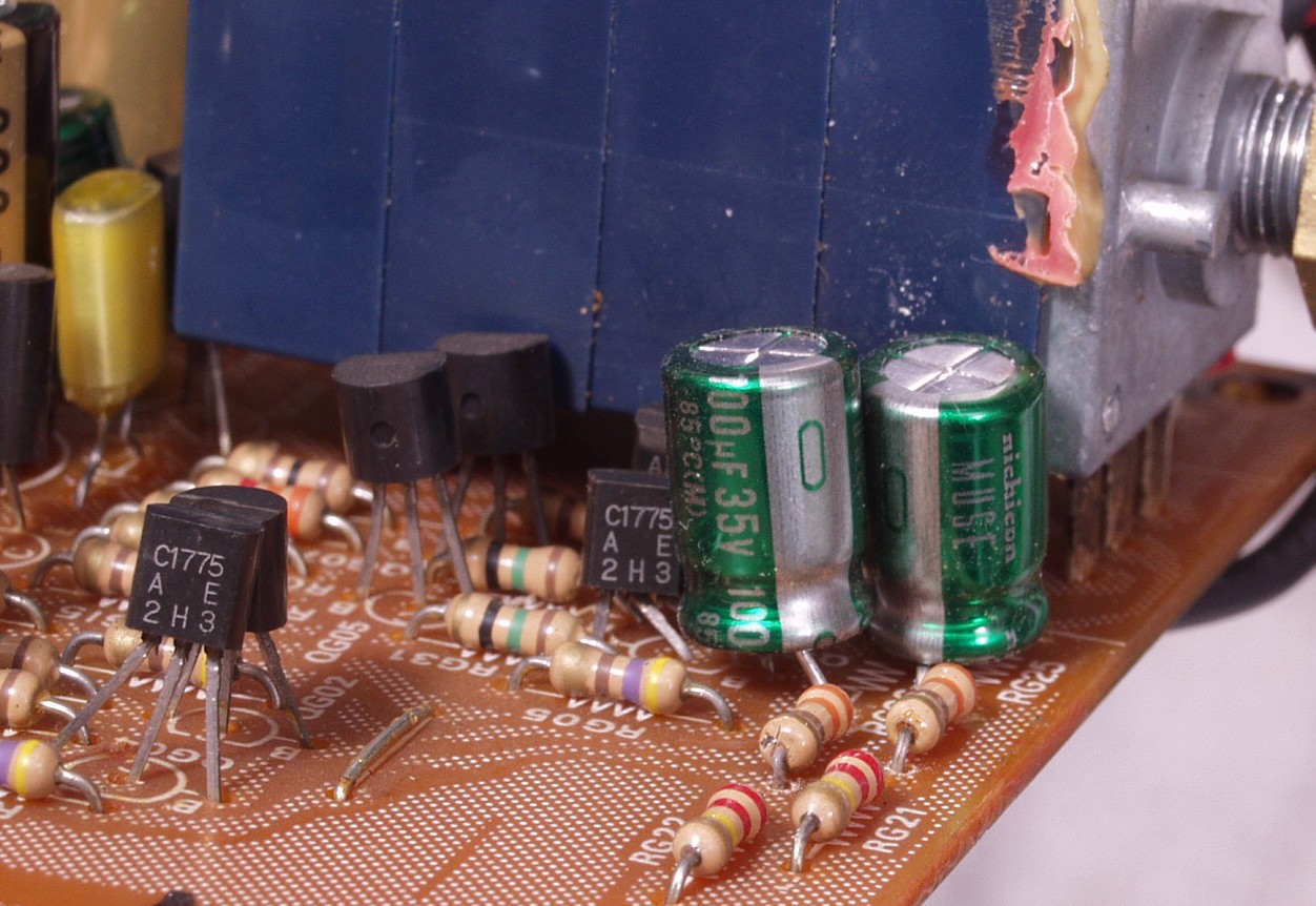 | C−7A. 修理前 MC−AMP基板 シールドケース内なので電解コンデンサーの頭のビニールの剥けが大きい | ||||||||||||||||||||