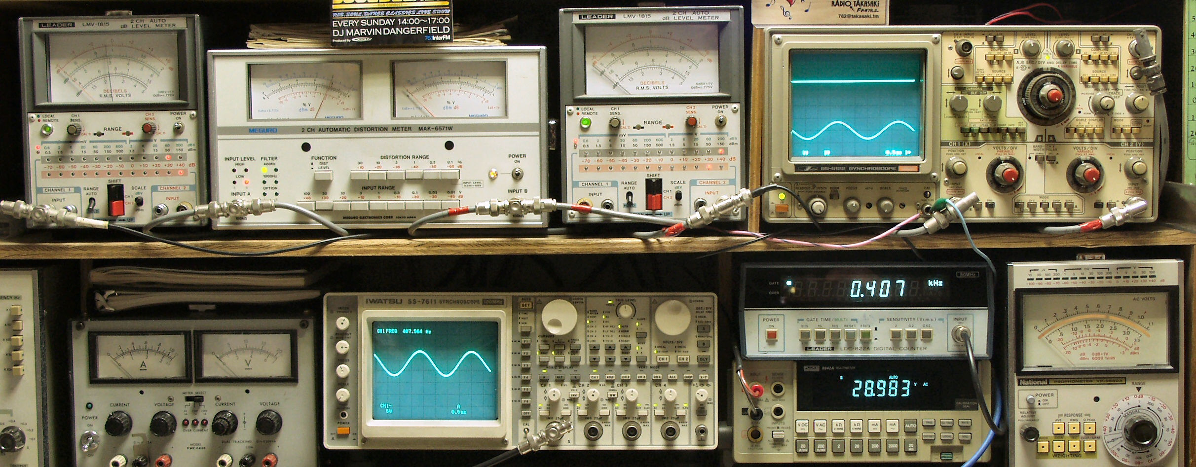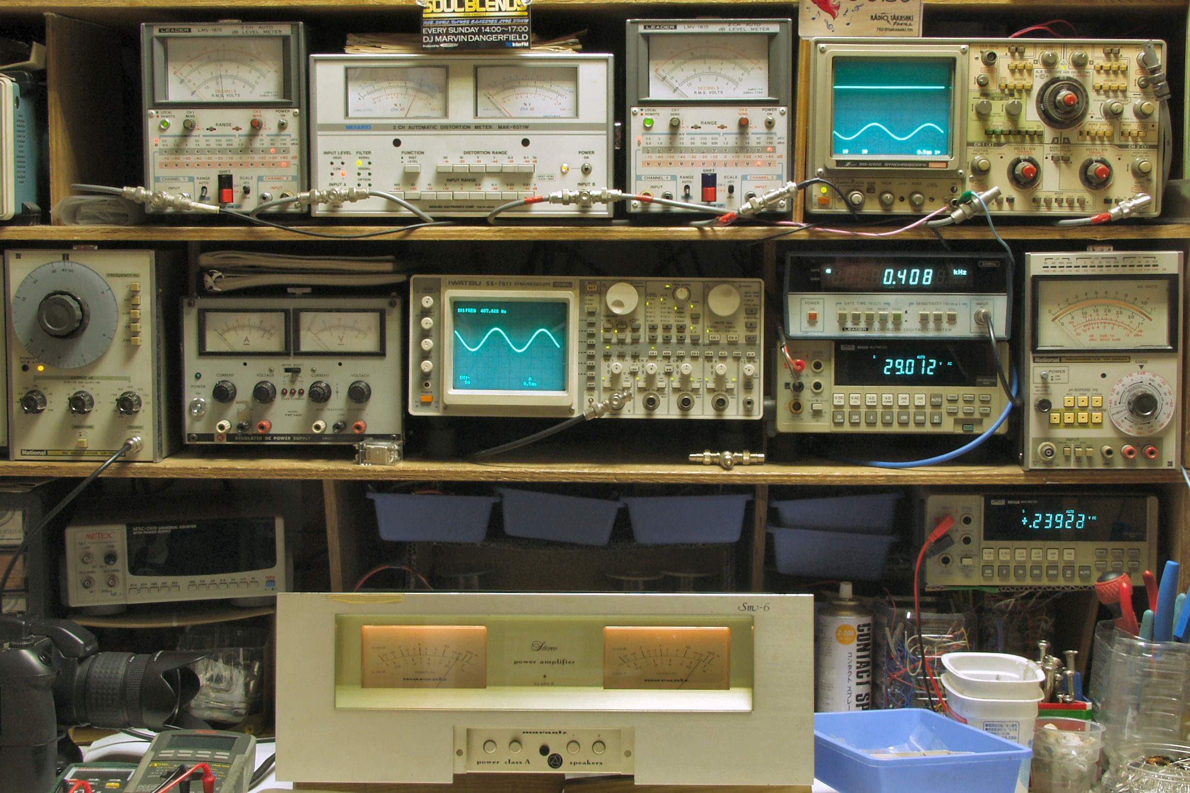 | AE. 修理前の測定 AE−1. 出力・歪み率測定 <見方> 下段左端 オーディオ発振器より400HZ・1KHZの信号を出し(歪み率=約0.003%)これをAMPに入力し、出力を測定 下段中左 オシロ=入力波形(オーディオ発振器のTTLレベル) 下段中右上=周波数計 上段左端 電圧計=L側出力電圧測定、黒針のみ使用 上段中左 歪み率計=出力の歪み率測定 左メータ=L出力、右メータ=R出力 上段中右 電圧計=R側出力電圧測定、赤針のみ使用 上段右端 オシロ=出力波形 上=R出力、下=L出力(実際にはRL電圧計の出力「Max=1V」を観測) 下段中右上 デジタル電圧計=出力電圧測定RLは切り替えて測定 |