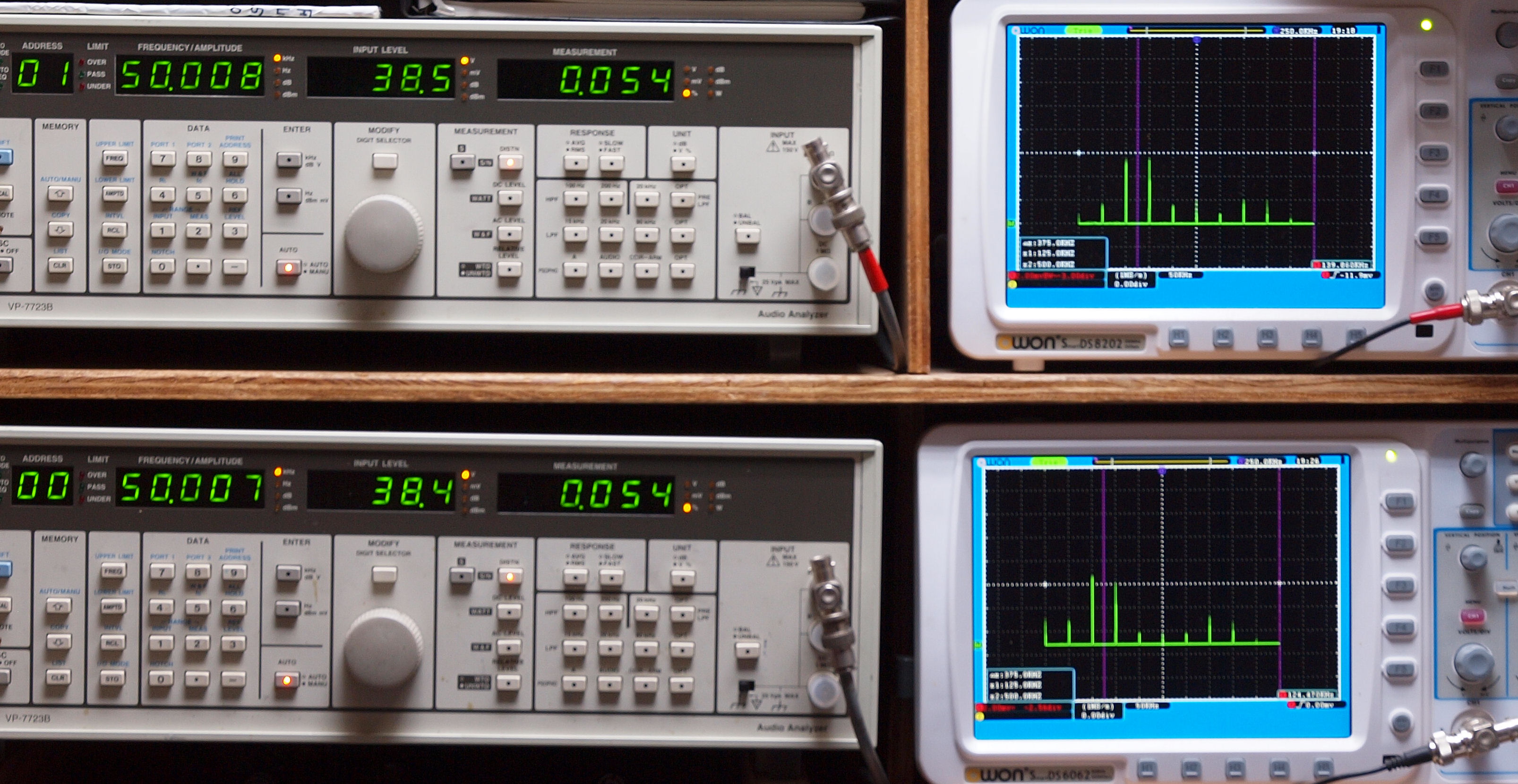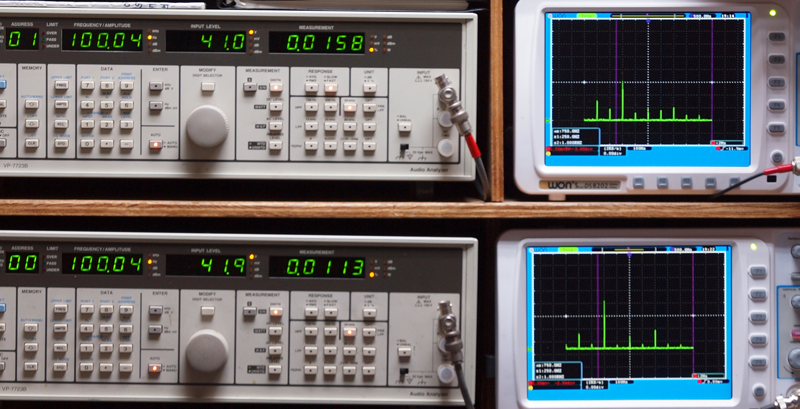 | E. 測定・調整 E1. 出力・歪み率測定・調整 「見方」。 上段中 右側SP出力を「Audio Analyzer Panasonic VP−7723B」により測定。 表示LED、 左端=メモリーNo、 中左=周波数測定、 中右=出力電圧測定、 右端=歪み率測定。 上段右端 VP−7723Bの基本波除去出力を「owon SDS8202(200MHZ)」で「FFT分析」表示。 下段中 左側SP出力を「Audio Analyzer Panasonic VP−7723B」により測定。 表示LED、 左端=メモリーNo、 中左=周波数測定、 中右=出力電圧測定、 右端=歪み率測定。 下段右端 VP−7723Bの基本波除去出力を「owon SDS6062(200MHZ)」で「FFT分析」表示。 下段左端 オーディオ発振器 VP−7201A より50Hz〜100kHzの信号を出し(歪み率=約0.003%)、ATT+分配器を通し、AMPに入力。 よって、ダイアル設定出力レベルより低くなります。測定機器の仕様や整備の様子はこちら、「VP−7723B」「VP−7201A」。 FFT画面の見方はこちら。 |