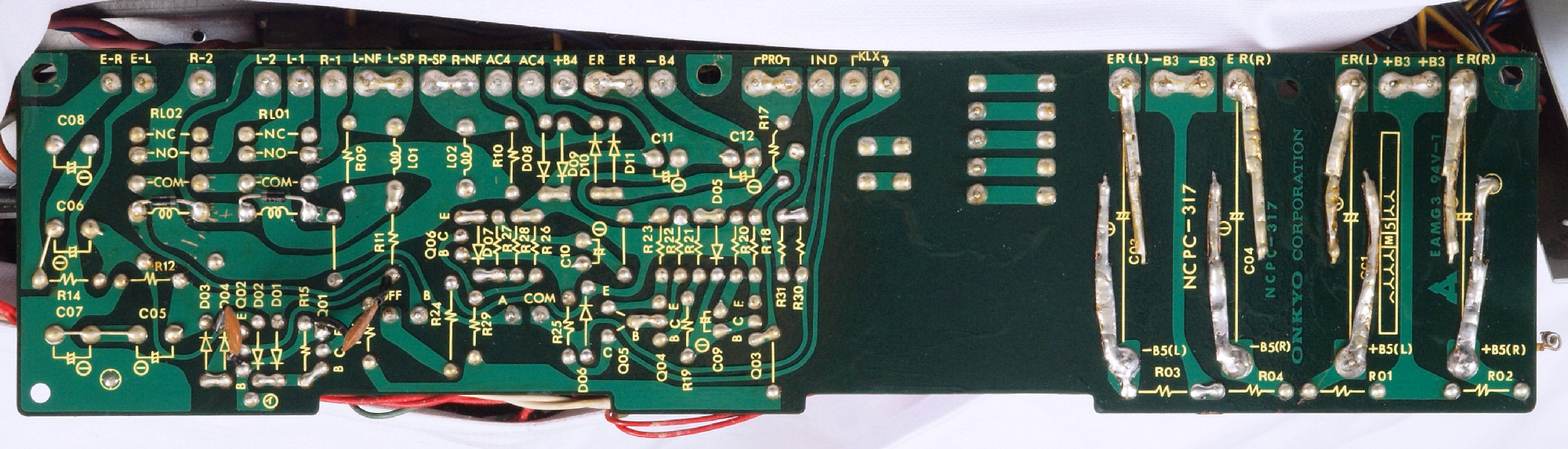 C54. 修理(半田補正)後 R側プリAMP・ピークモニター基板裏  半田を全部やり直す