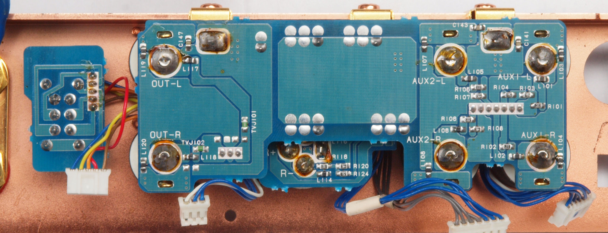 | CC3. 修理後 使用しない端子にはキャップを挿す。 ユーザーはマルチアンプの低域に使用予定。入力RCA端子はショウトピン、出力RCA端子は防塵キャップ。 |