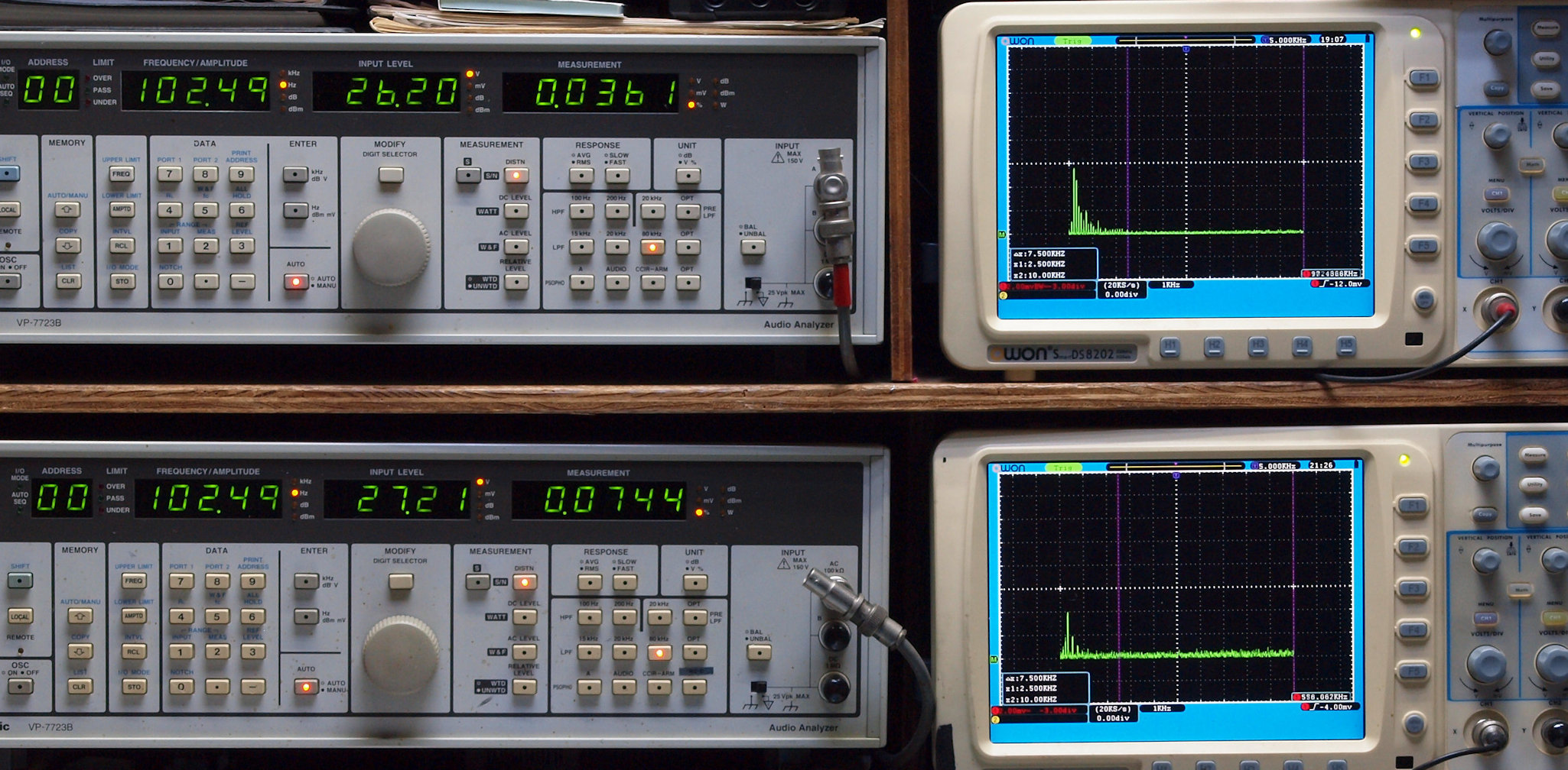 | E. 測定・調整。 画像をクリックすると、大きく(横幅2050ドット)表示されます。 E0. 出力・歪み率測定・調整 「見方」。 上段中 右側SP出力を「Audio Analyzer Panasonic VP−7723B」により測定。 表示LED、 左端=メモリーNo、 中左=周波数測定、 中右=出力電圧測定、 右端=歪み率測定。 上段右端 VP−7723Bの基本波除去出力を「owon SDS8202(200MHZ)」で「FFT分析」表示。 下段中 左側SP出力を「Audio Analyzer Panasonic VP−7723B」により測定。 表示LED、 左端=メモリーNo、 中左=周波数測定、 中右=出力電圧測定、 右端=歪み率測定。 下段右端 VP−7723Bの基本波除去出力を「owon SDS6062(200MHZ)」で「FFT分析」表示。 下段左端 オーディオ発振器 VP−7201A より50Hz〜100kHzの信号を出し(歪み率=約0.003%)、ATT+分配器を通し、AMPに入力。 よって、ダイアル設定出力レベルより低くなります。測定機器の仕様や整備の様子はこちら、「VP−7723B」「VP−7201A」。 FFT画面の見方はこちら。 入出力点検確認。 ライン1のアナログ入力、ライン2のバランス入力 、ライン出力点検確認済み。 デジタルNo1のST入力、デジタルNo2のBNCケーブル入力、デジタルNo3のRCAケーブル入力点検確認済み。 デジタルNo4の光ケーブル入力、デジタルNo5のSACD/1ビット入力(RCA入力)点検確認済み。 80kHz前後にクロック漏れが200mVPP(10mVrms)位あり、80kHzのローパスフイルターを挿入して測定。 仕様では、0.05%(1kHz、1W出力時) |