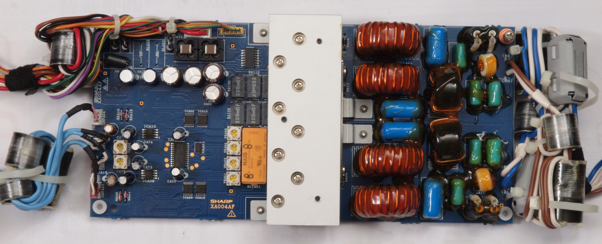 | C71. 修理中 SP接続リレー基板。 リレー定格電流5Aなので、5A×5A×4Ω=200W。4オーム出力の時はバイワイヤーが良い。 |