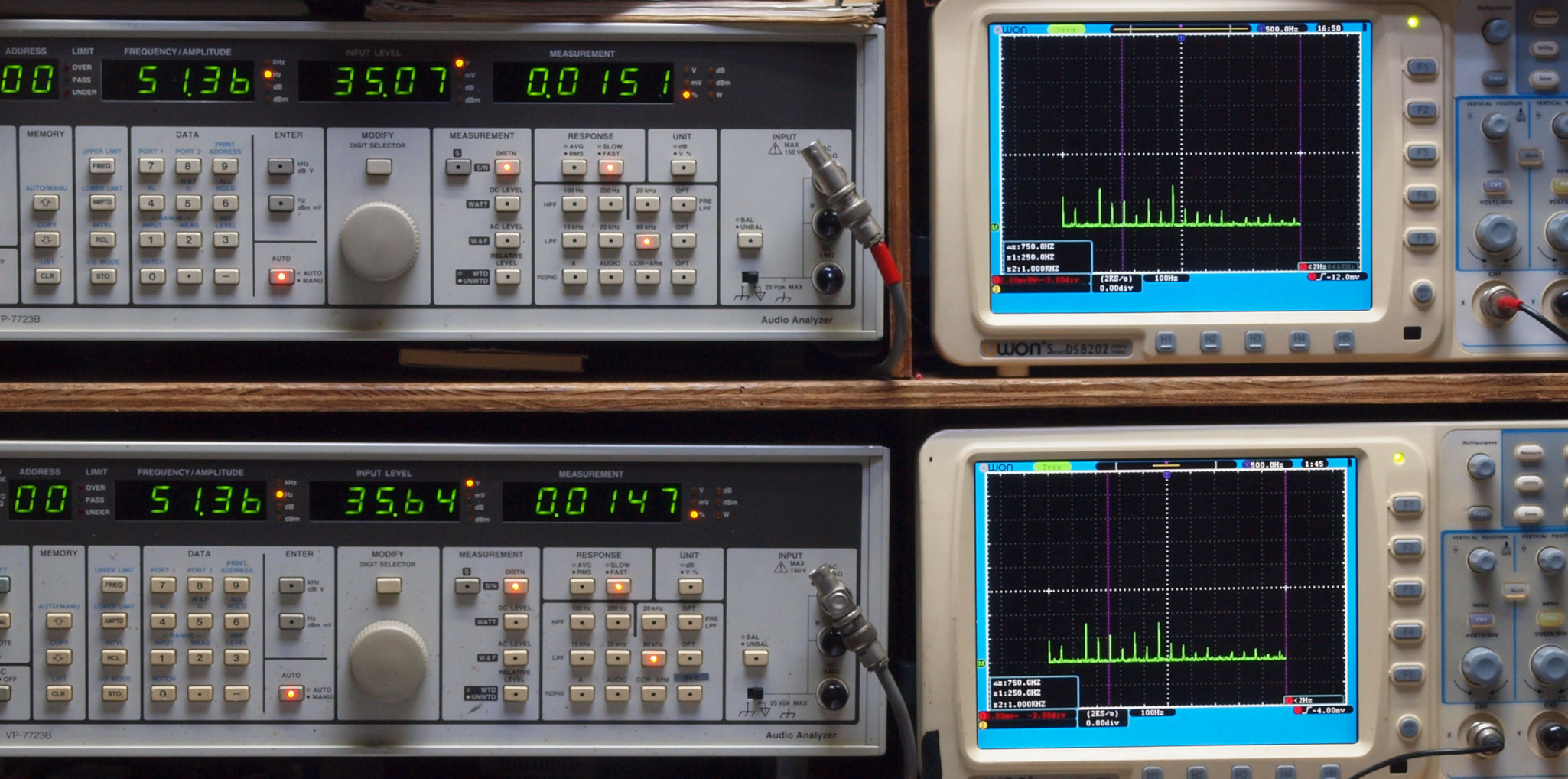 | E1. 50Hz入力、R側SP出力電圧35V=153W出力、 0.0151%歪み。 L側SP出力電圧35V=153W出力、 0.0147%歪み。 「FFT分析」のオシロのカーソル周波数、左=250Hz、右=1kHz。 |