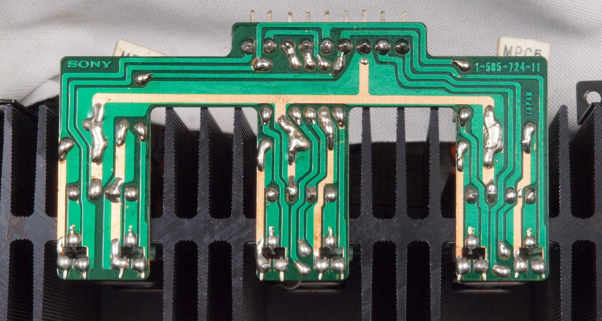 | C52. 修理(半田補正)後 L側終段V-FET(縦型電解効果トランジスター)基板裏 半田を全部やり直す。 | ||||||||||||||||||||||||||||||||||