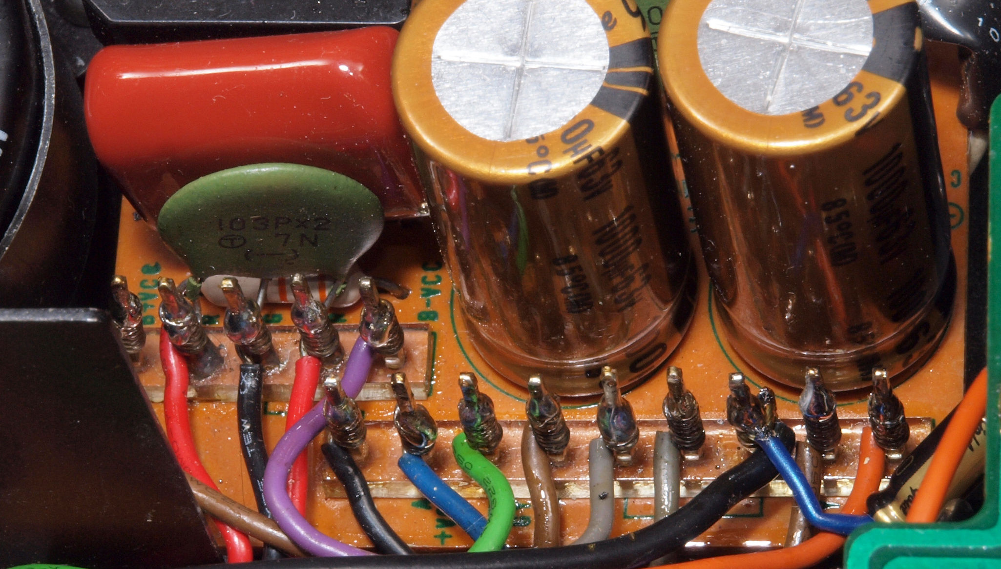 | C92. 修理後 電源ブロック電解コンデンサー下。 フイルムコンデンサー4個追加。終段V−FET(縦型電解効果トランジスター)保護ヒューズ4本挿入。 |