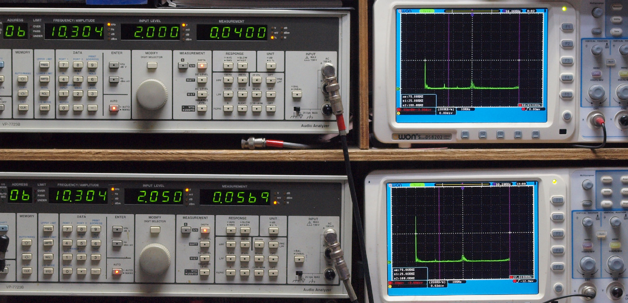 | E. 調整・測定。 画像をクリックすると、大きく(横幅2050ドット)表示されます。 E0. 出力・歪み率測定・調整。 「見方」。 上段中 右側出力を「Audio Analyzer Panasonic VP−7723B」により測定。 表示LED、 左端=メモリーNo、 中左=周波数測定、 中右=出力電圧測定、 右端=歪み率測定。 上段右端 VP−7723Bの基本波除去出力を「owon SDS8202(200MHZ)」で「FFT分析」表示。 下段中 左側出力を「Audio Analyzer Panasonic VP−7723B」により測定。 表示LED、 左端=メモリーNo、 中左=周波数測定、 中右=出力電圧測定、 右端=歪み率測定。 下段右端 VP−7723Bの基本波除去出力を「owon SDS6062(200MHZ)」で「FFT分析」表示。 下段左端 オーディオ発振器 VP−7201A より50Hz〜100kHzの信号を出し(歪み率=約0.003%)、ATT+分配器を通し、AMPに入力。 よって、ダイアル設定出力レベルより低くなります。測定機器の仕様や整備の様子はこちら、「VP−7723B」「VP−7201A」。 FFT画面の見方はこちら。 |