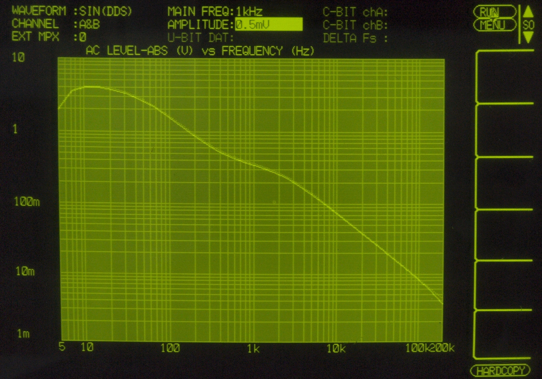 | F22. 入出力特性測定(MM入力) MC入力端子へ0.5mV入力 VRはmax 左出力=薄(細い)色 右出力=濃い(太い)色。 |