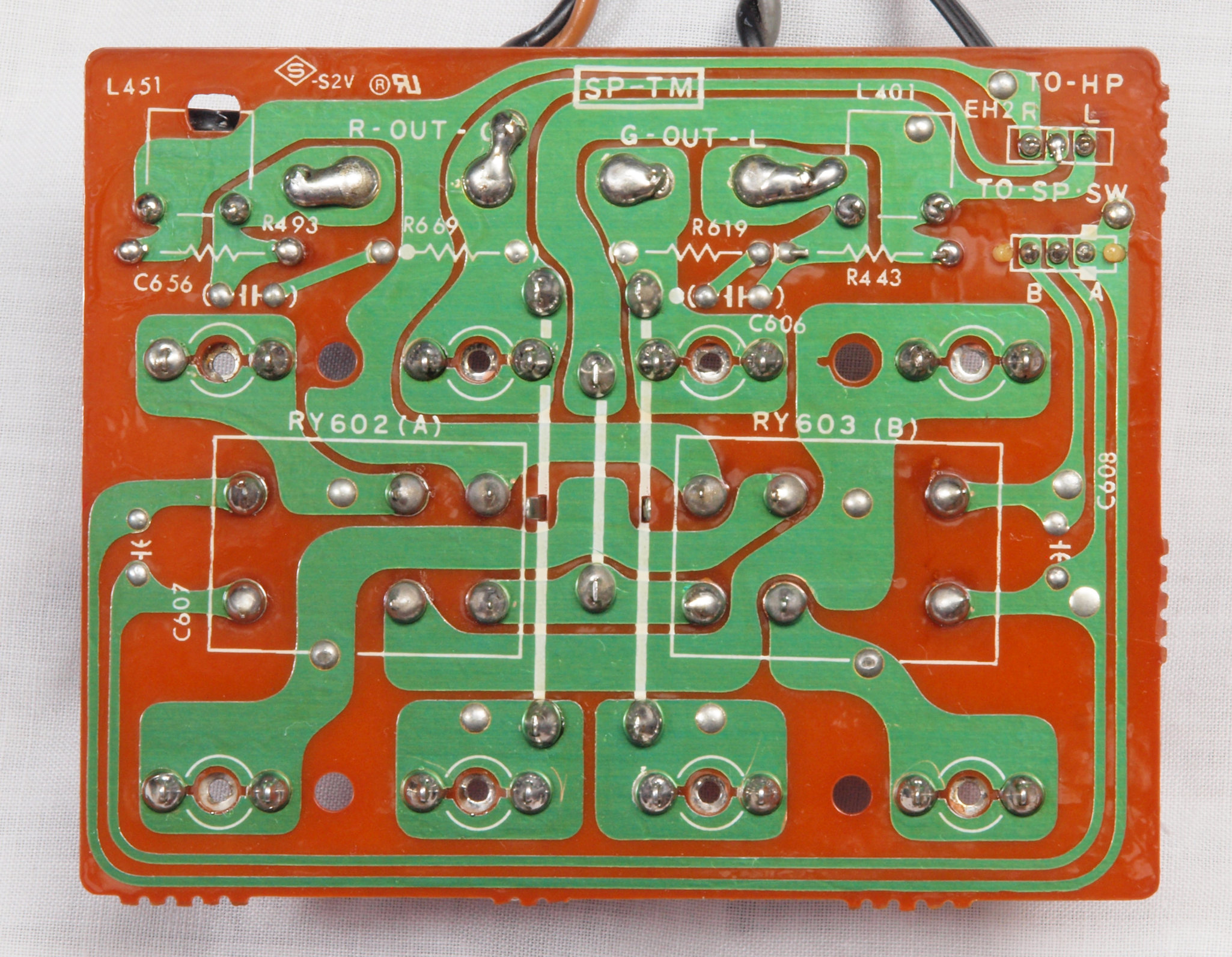 C213. 修理後 POWER AMP−A基板。 トルエン溶媒の接着剤を取り去り、ジャンパー線を交換後、コート液を塗布後。