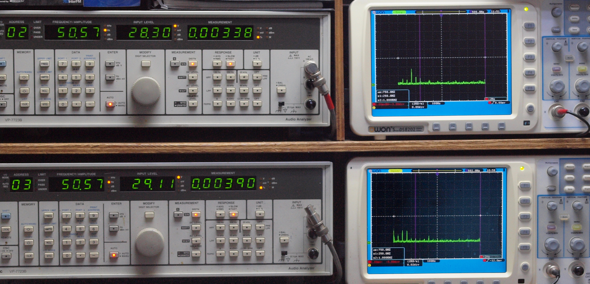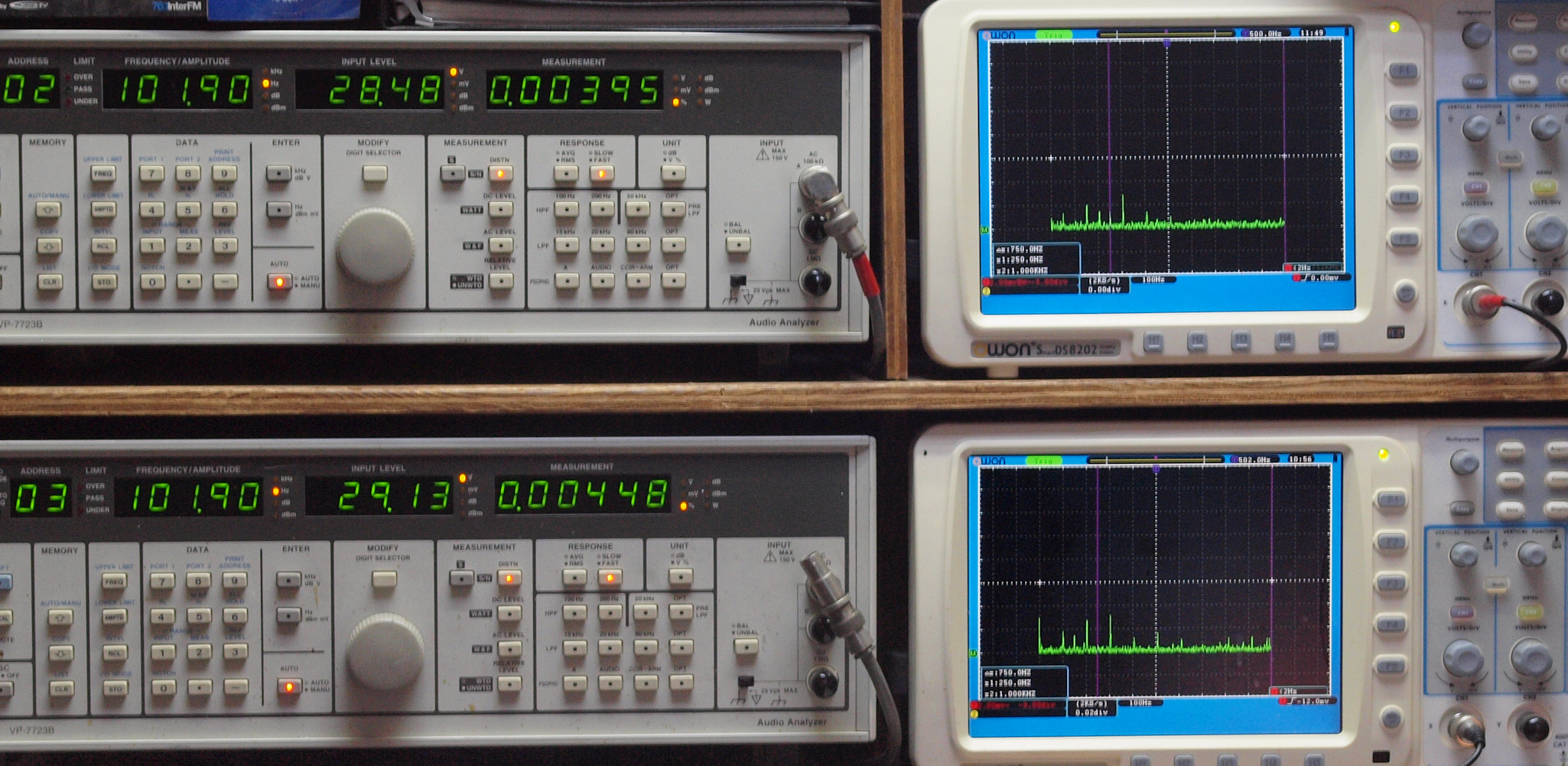 | E. 調整・測定。 画像をクリックすると、大きく(横幅2050ドット)表示されます。 E0. 出力・歪み率測定・調整。 「見方」。 上段中 右側SP出力を「Audio Analyzer Panasonic VP−7723B」により測定。 表示LED、 左端=メモリーNo、 中左=周波数測定、 中右=出力電圧測定、 右端=歪み率測定。 上段右端 VP−7723Bの基本波除去出力を「owon SDS8202(200MHZ)」で「FFT分析」表示。 下段中 左側SP出力を「Audio Analyzer Panasonic VP−7723B」により測定。 表示LED、 左端=メモリーNo、 中左=周波数測定、 中右=出力電圧測定、 右端=歪み率測定。 下段右端 VP−7723Bの基本波除去出力を「owon SDS6062(200MHZ)」で「FFT分析」表示。 下段左端 オーディオ発振器 VP−7201A より50Hz〜100kHzの信号を出し(歪み率=約0.003%)、ATT+分配器を通し、AMPに入力。 よって、ダイアル設定出力レベルより低くなります。測定機器の仕様や整備の様子はこちら、「VP−7723B」「VP−7201A」。 FFT画面の見方はこちら。 |