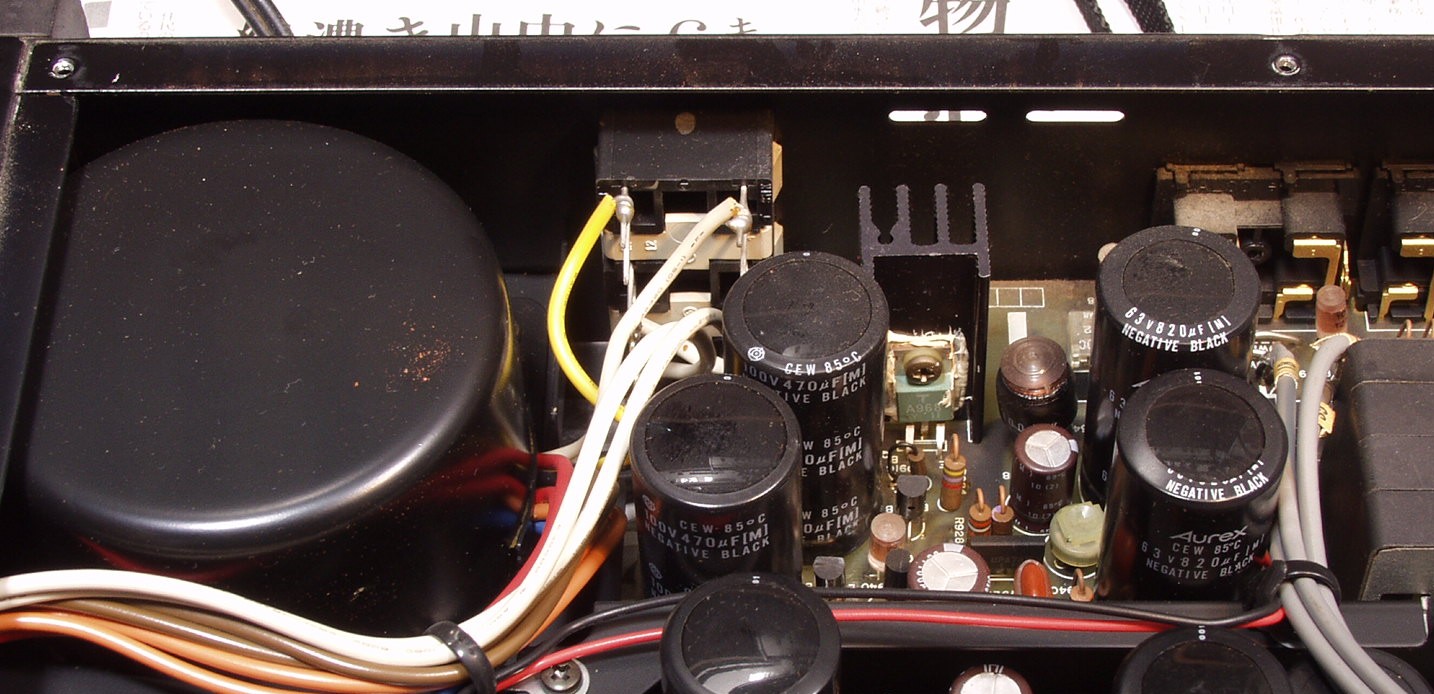 | A6. 電解コンデンサー 左上=交換する1500μ 右上=交換する1000μ/100V 左下=付いていた470μ 右下=付いていた820μ/63V Aurexの名前が!! |