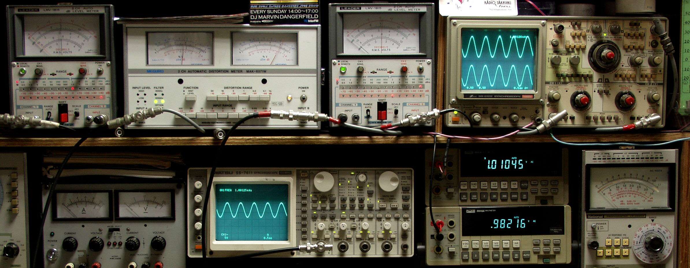上段中左 歪み率計=SP出力の歪み率測定 左メータ=L出力、右メータ=R出力