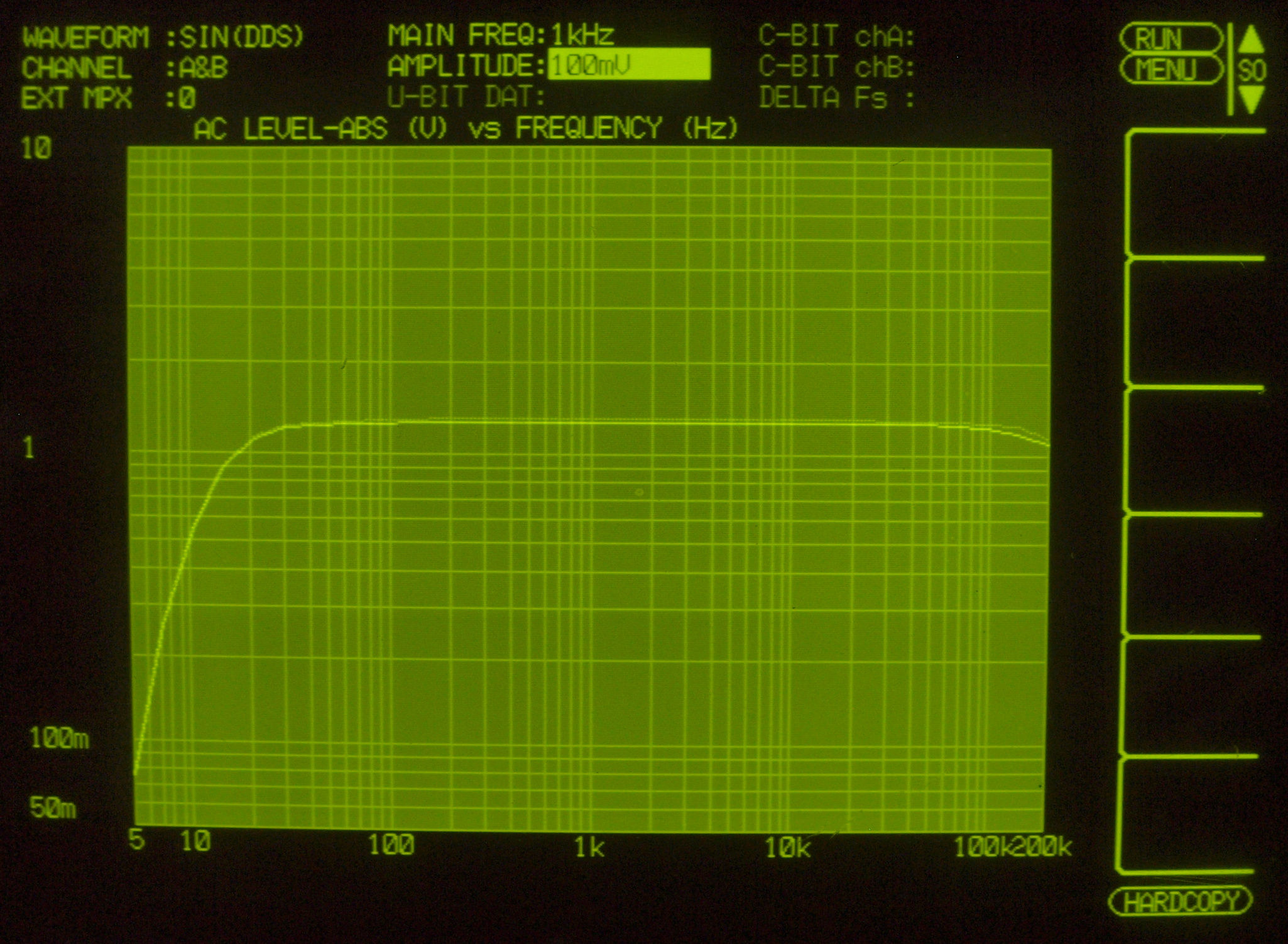 AUX入力端子へ100mV一定入力 VRはmax 平均で1V出力   左出力=薄(細い)色 右出力=濃い(太い)色