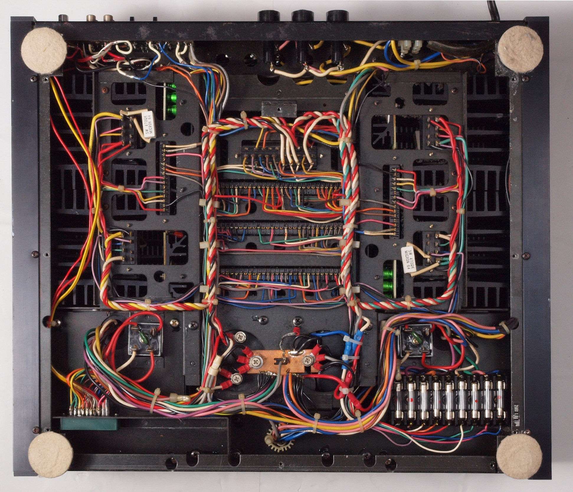 リヤパネルのフューズは飛んでいないのですが、底蓋を 開けて中を見ると9本のフューズの内、中央側から3本目と5本目の1Aが飛んでいて、新しくしても又同じフューズが 飛んでしまいます。