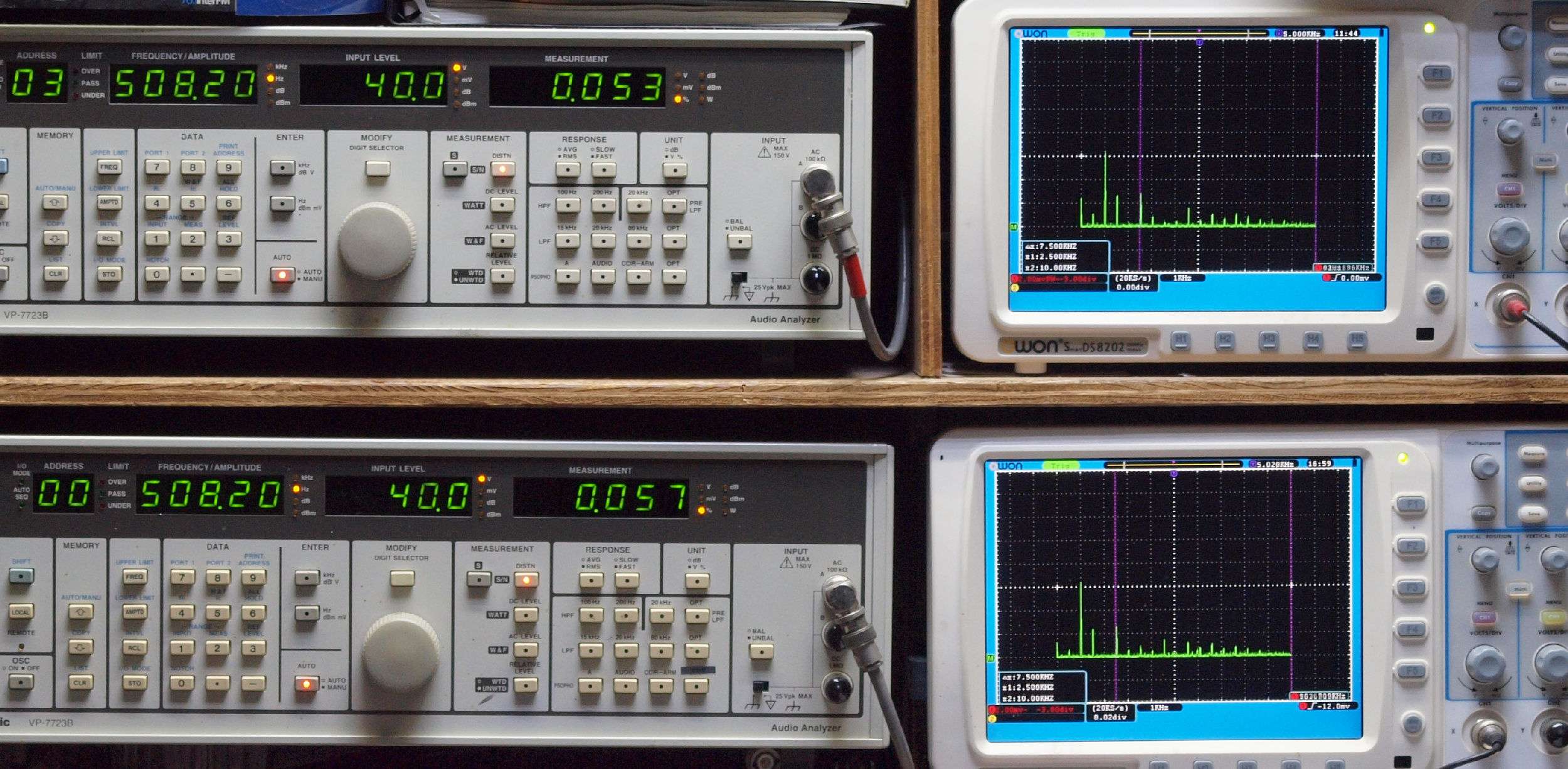 | E. 測定・調整。画像をクリックすると、大きく(横幅2050ドット)表示されます。 E1. 出力・歪み率測定・調整 「見方」。 上段中 右側SP出力を「Audio Analyzer Panasonic VP−7723B」により測定。 表示LED、 左端=メモリーNo、 中左=周波数測定、 中右=出力電圧測定、 右端=歪み率測定。 上段右端 VP−7723Bの基本波除去出力を「owon SDS8202(200MHZ)」で「FFT分析」表示。 下段中 左側SP出力を「Audio Analyzer Panasonic VP−7723B」により測定。 表示LED、 左端=メモリーNo、 中左=周波数測定、 中右=出力電圧測定、 右端=歪み率測定。 下段右端 VP−7723Bの基本波除去出力を「owon SDS6062(200MHZ)」で「FFT分析」表示。 下段左端 オーディオ発振器 VP−7201A より50Hz〜100kHzの信号を出し(歪み率=約0.003%)、ATT+分配器を通し、AMPに入力。 よって、ダイアル設定出力レベルより低くなります。測定機器の仕様や整備の様子はこちら、「VP−7723B」「VP−7201A」。 FFT画面の見方はこちら。 下記は、上記の付いていた純正2SK−77を使用して測定。 |