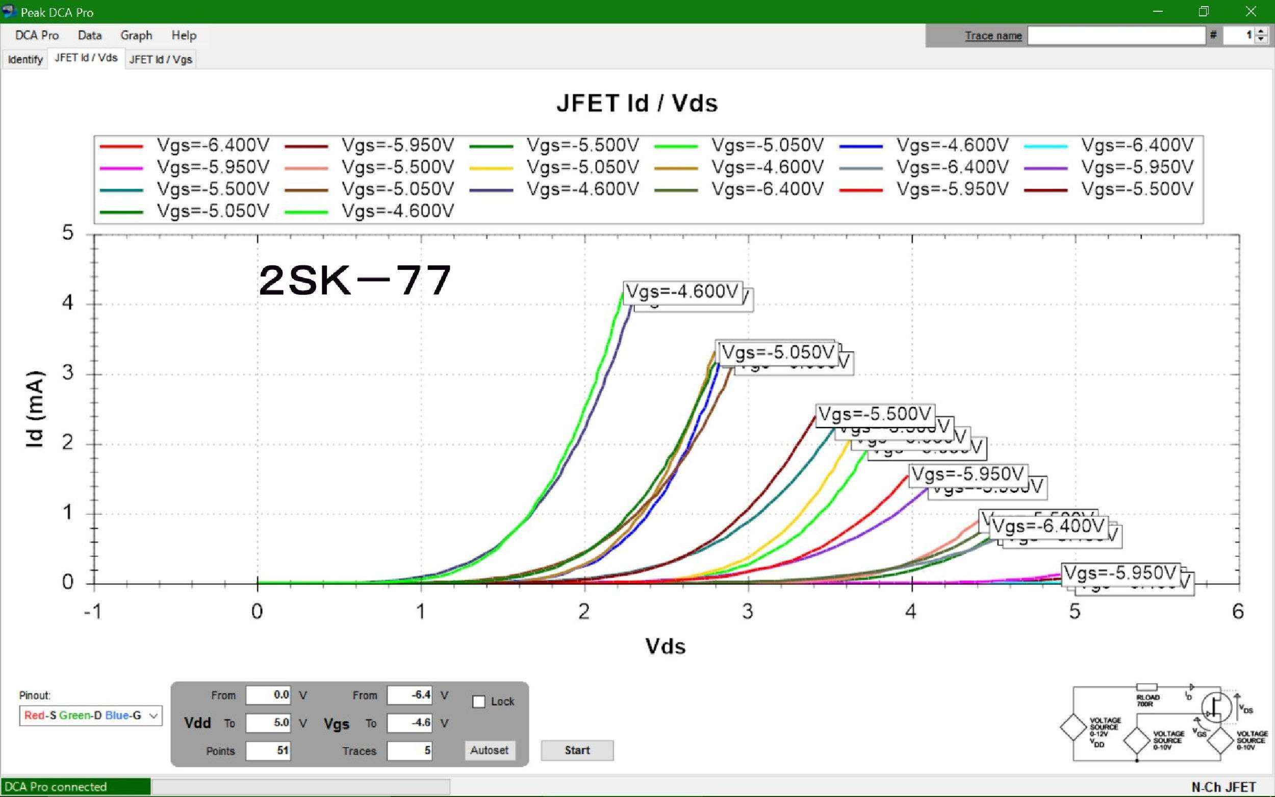 | A. 2SK77、2SK180、THF51s測定。画像をクリックすると、大きく(横幅2050ドット)表示されます。 A11. 2SK77をatlas DCA Proで自動測定中。 |